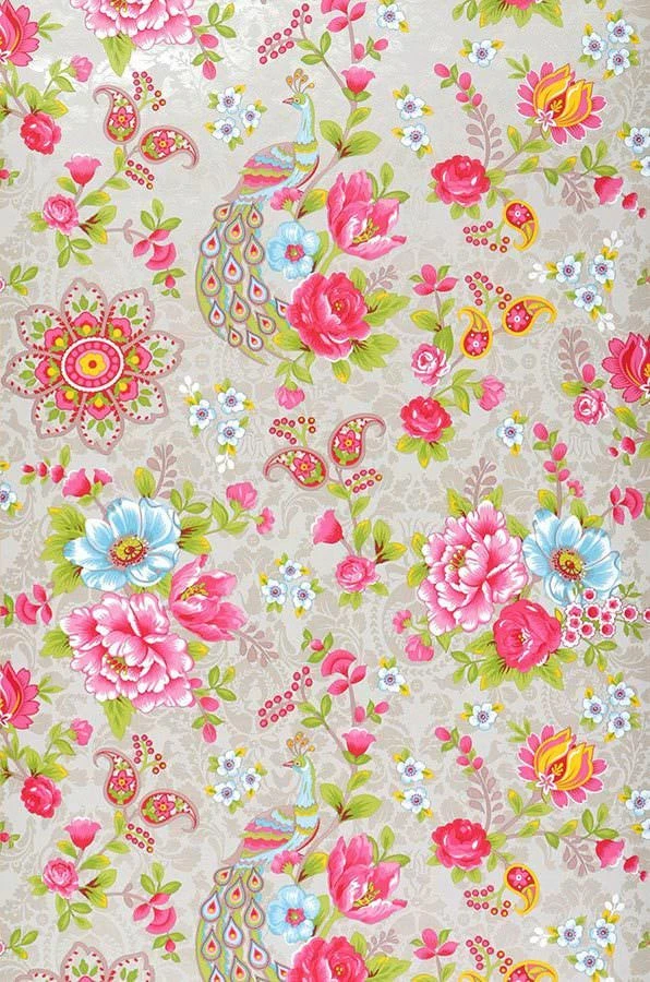 Erlesene Blumenarrangements, dazwischen prachtvolle Pfauen, das zeugt von erlesenem Geschmack. Hellbeigegrau überzeugt hier als Grundfarbe dieser beliebten floralen Tapete.