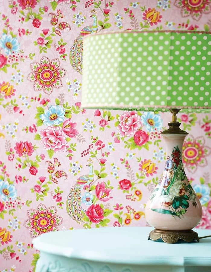 Erlesene Blumenarrangements, dazwischen prachtvolle Pfauen, das zeugt von erlesenem Geschmack. Rosa überzeugt hier als Grundfarbe dieser beliebten floralen Tapete.