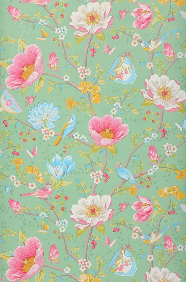 Zwischen der blumigen Vielfalt hängen Tassen an Zweigen, kleine Vögel und Schmetterlinge bewundern die Farbenpracht. Wer würde sich in dieser pastellgrünen Fantasiewelt nicht wohl fühlen?