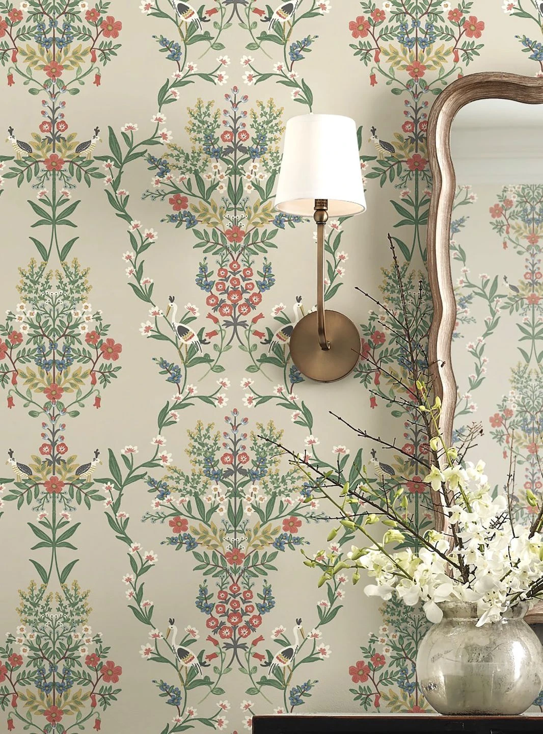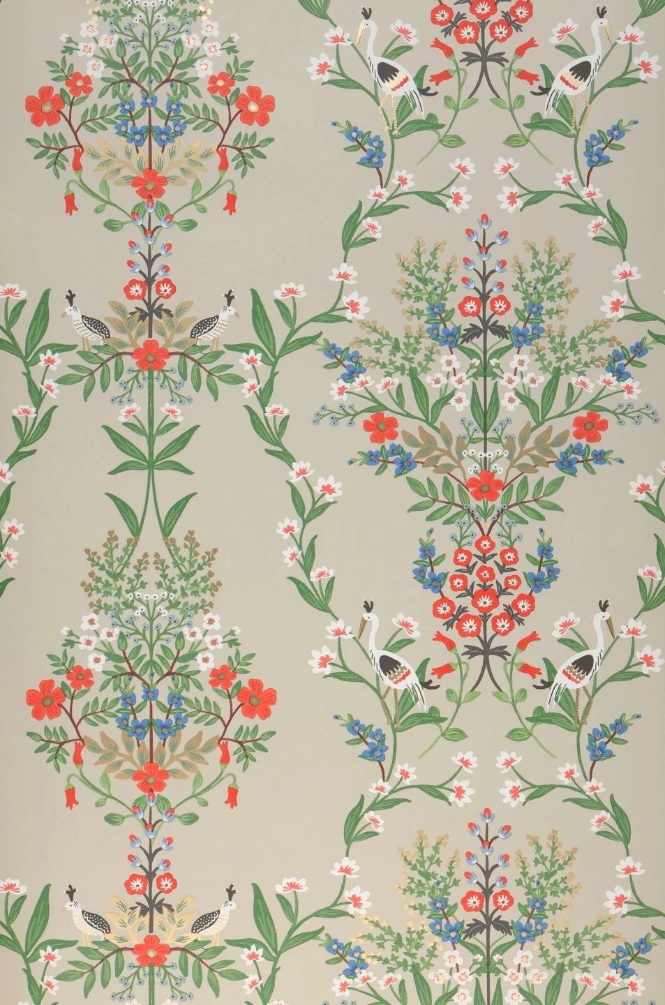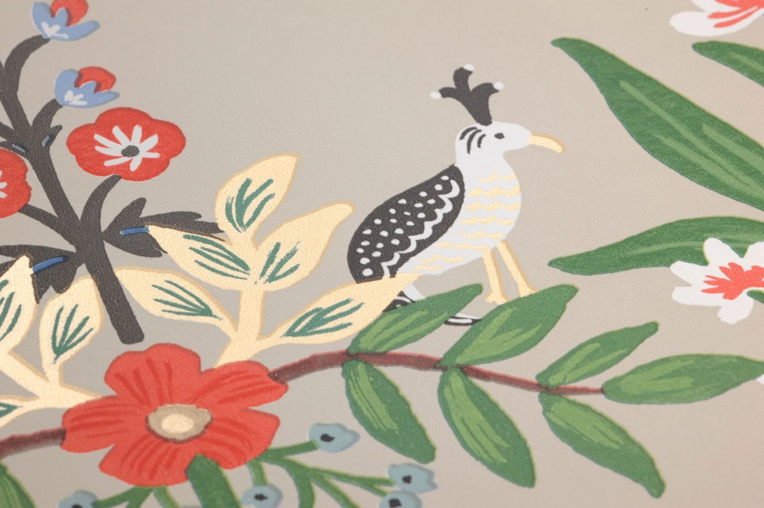 Luftig und beinahe schwerelos wirken die kunstvoll arrangierten Blumenbouquets und Blütenranken auf der außergewöhnlich schönen Papiertapete Luxembourg von Rifle Paper. Alle Farben harmonieren miteinander und wurden so gewählt, dass sie zusammen mit dem kieselgrauen Grund einen Hauch von Vintage-Romantik ausstrahlen. Die zarten Blumen und Vögel des Musters werden durch Details in schimmerndem Perlgold wirkungsvoll betont.