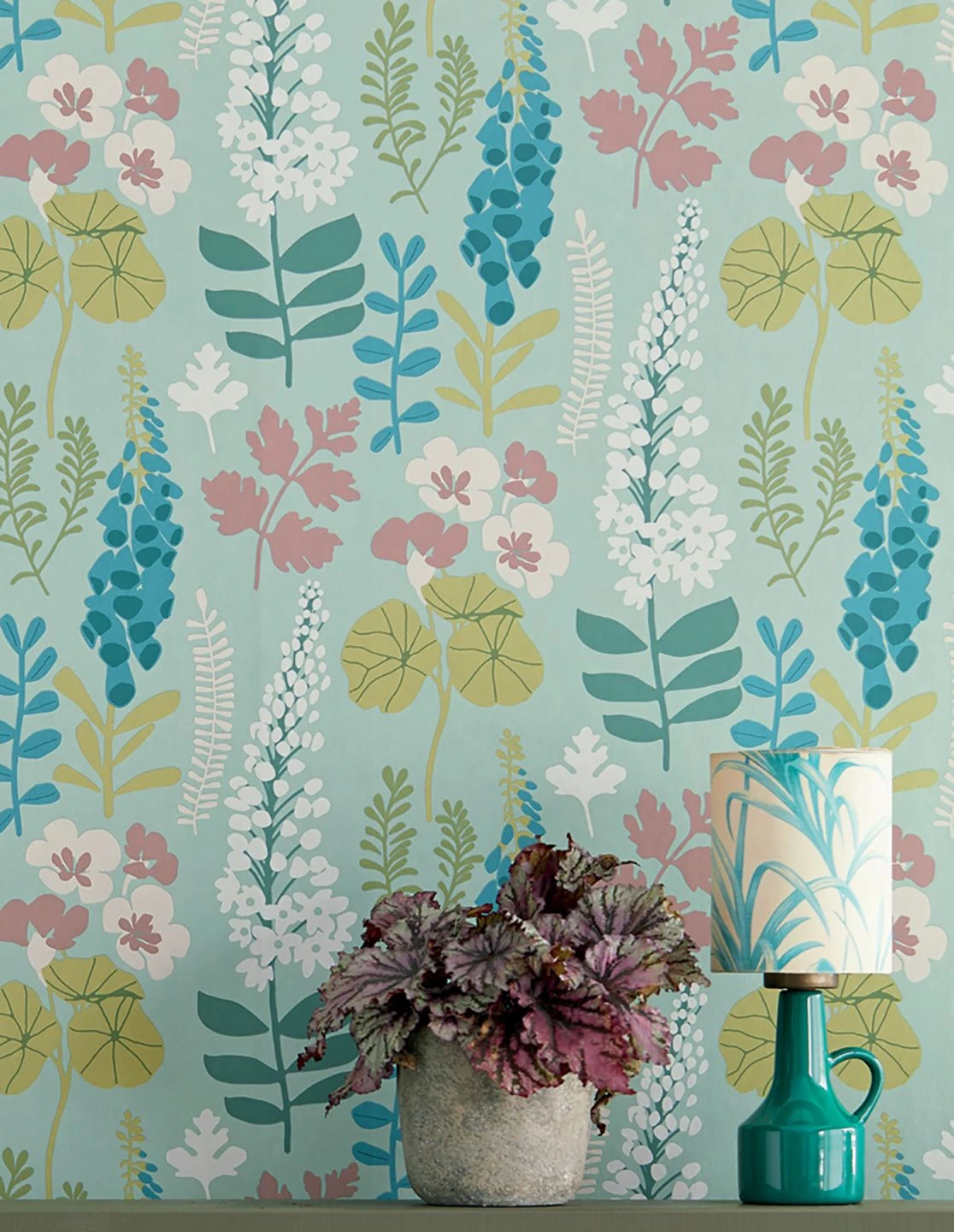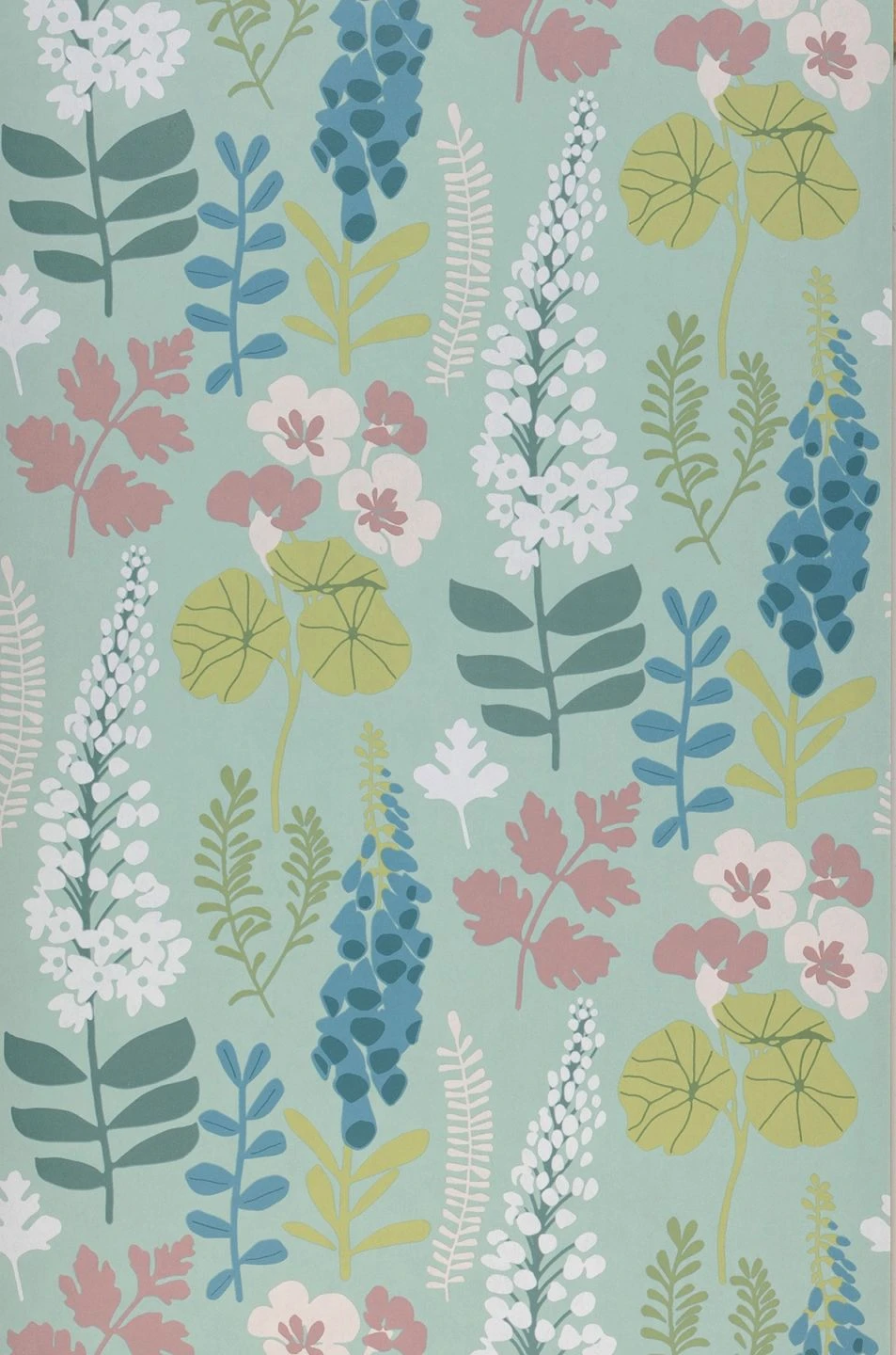 Tapete Luzie im fröhlichen Farbenmix aus Minttürkis, Azurblau, Creme, Hellgrün, Hellweinrot und Weiss macht ungebändigte Lust auf die Natur. Hochwachsende Doldenblüten, Lupinellen und Farnblüher strecken sich in starkem Wachstum dem Himmel entgegen. Die waschbeständige Vliestapete überträgt ihre Energie auch auf die Raumstimmung.