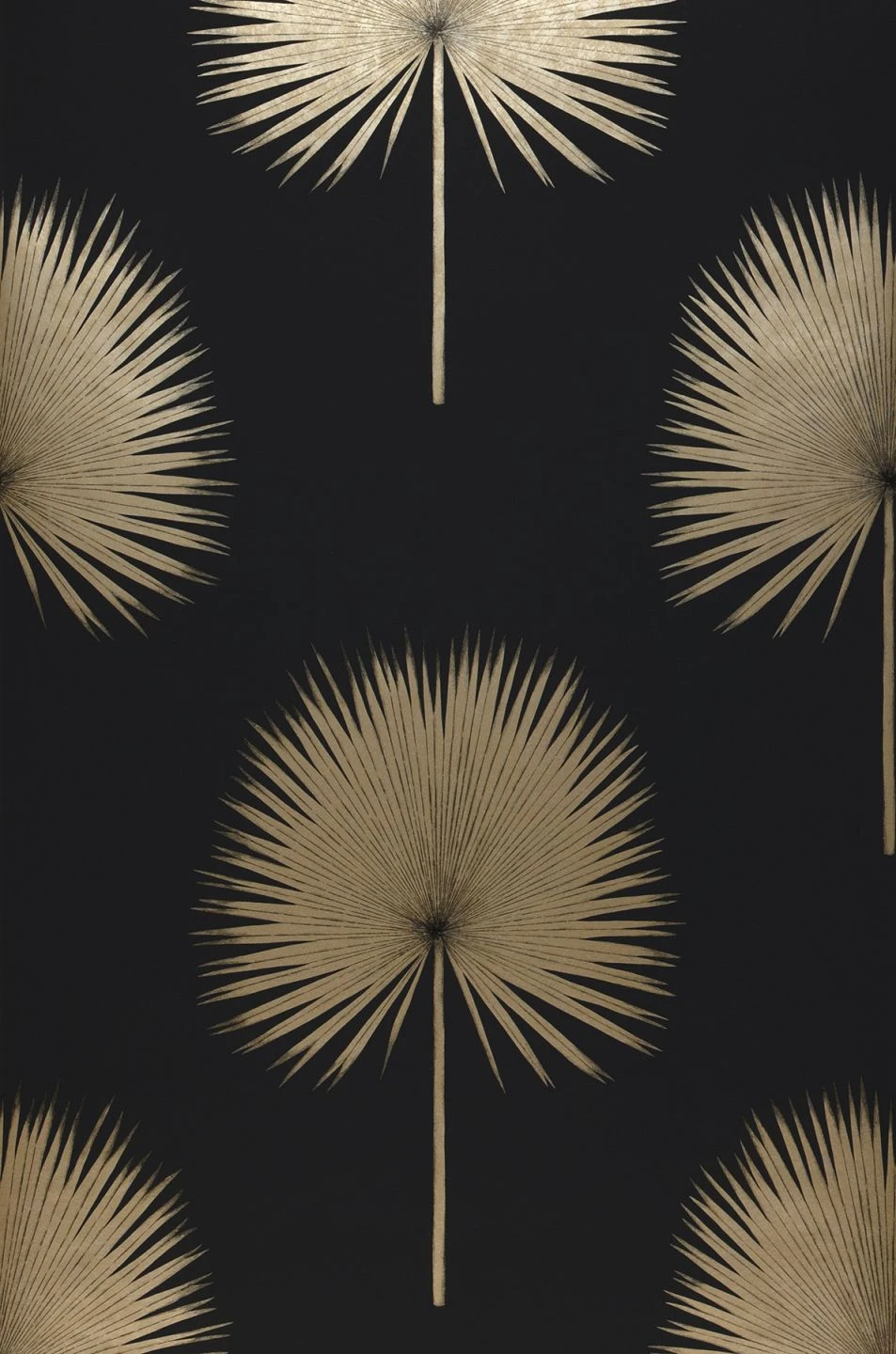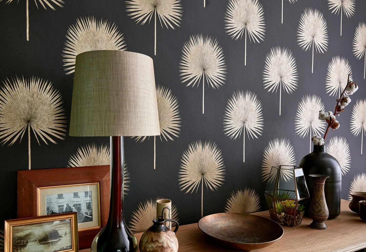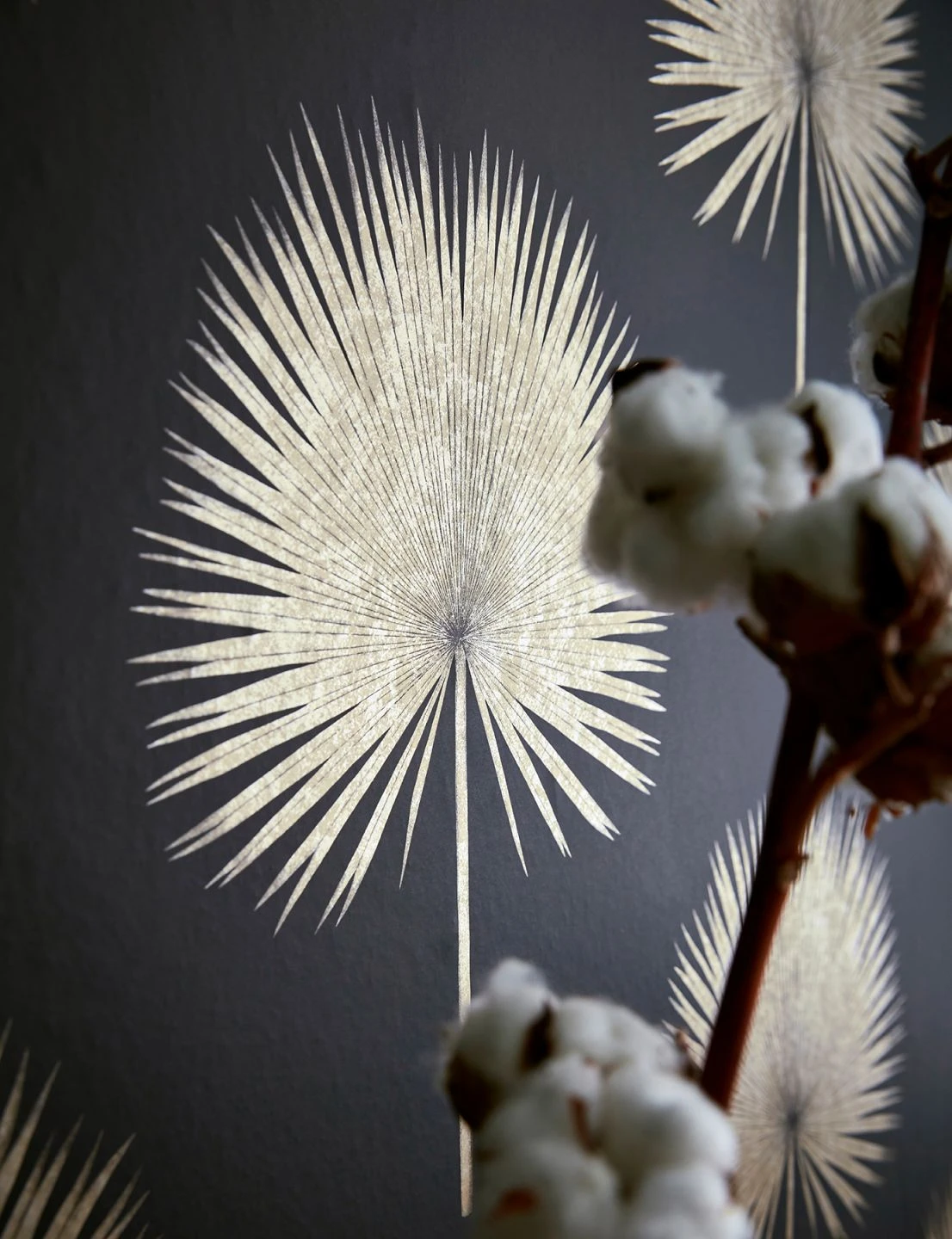 Stilisierte Palmenzweige in Mattgold auf Schwarzgrau definieren ein neues Naturraumgefühl, das vom schimmernden Muster ebenso lebt wie von der Präzision der Stilblüten. Der grüne Raum muss nicht immer bildlich grün sein, er kann auch eine mondäne Form annehmen, wie die glamouröse Designtapete beweist.
