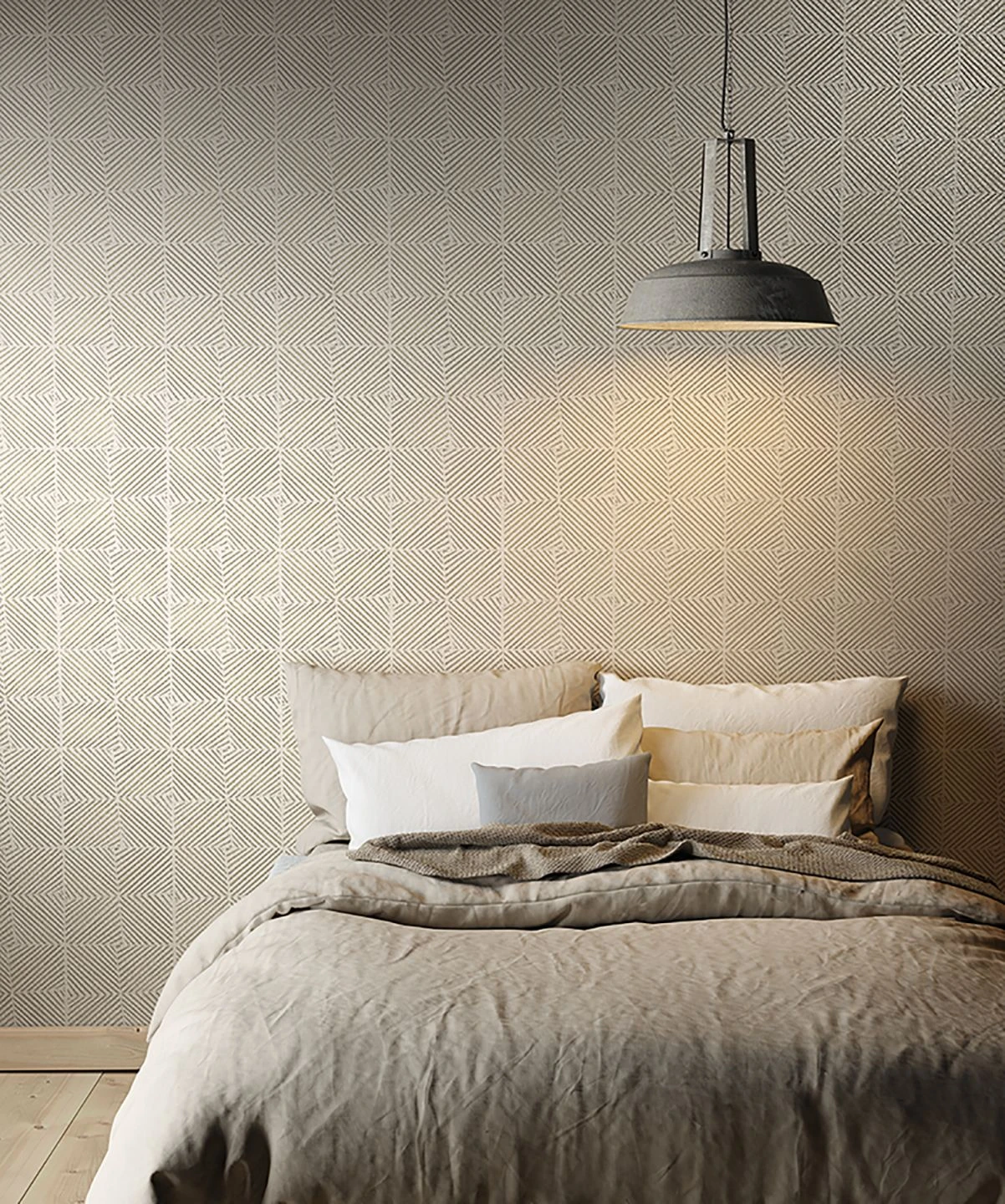 Schräg ist das neue Gerade, jedenfalls auf der ausgefallenen Tapete Maion, die das Auge mit psychedelischen Effekten unterhält. Das Wechselspiel zwischen Hellgrau und Beigegrau in Verbindung mit der fühlbaren Reliefstruktur beweist eindrucksvoll wie anziehend Gegensätze doch sind.
