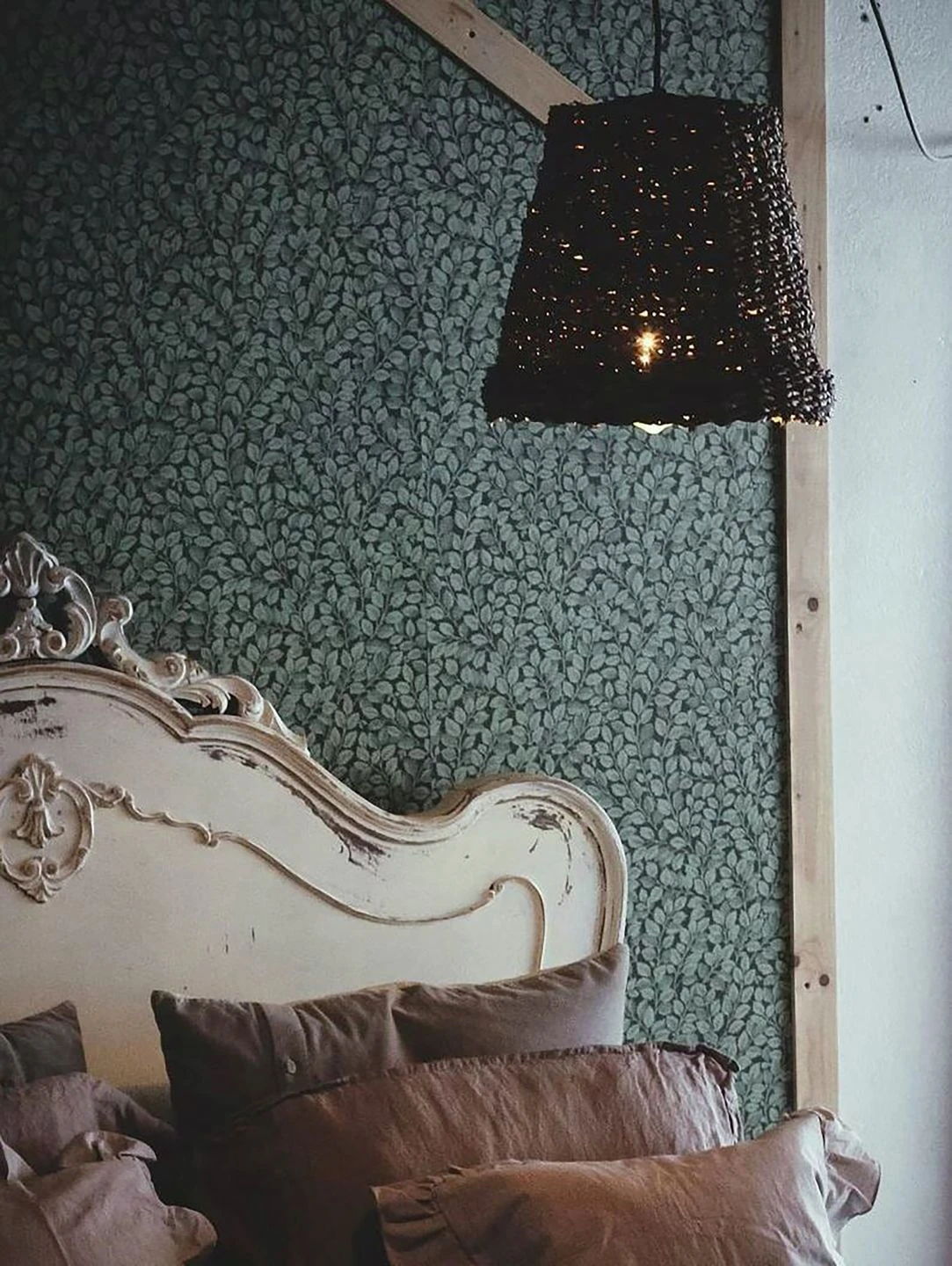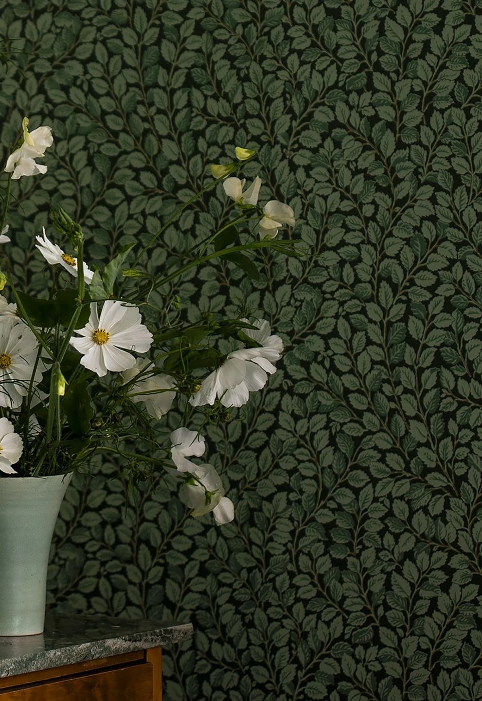 Geborgen in einem schützenden Dickicht aus grünen Blättern können Sie sich mit der botanischen Tapete „Malva“ fühlen. Über und über bedeckt mit Zweigen und Blättern in verschiedenen Nuancen von Grün auf schwarzgrünem Grund wirkt sie wie eine dicht bewachsene Gartenlaube. In Verbindung mit einer passenden Wandfarbe und Möbeln in Holzoptik kreieren Sie eine grüne Oase der Entspannung und Gemütlichkeit.