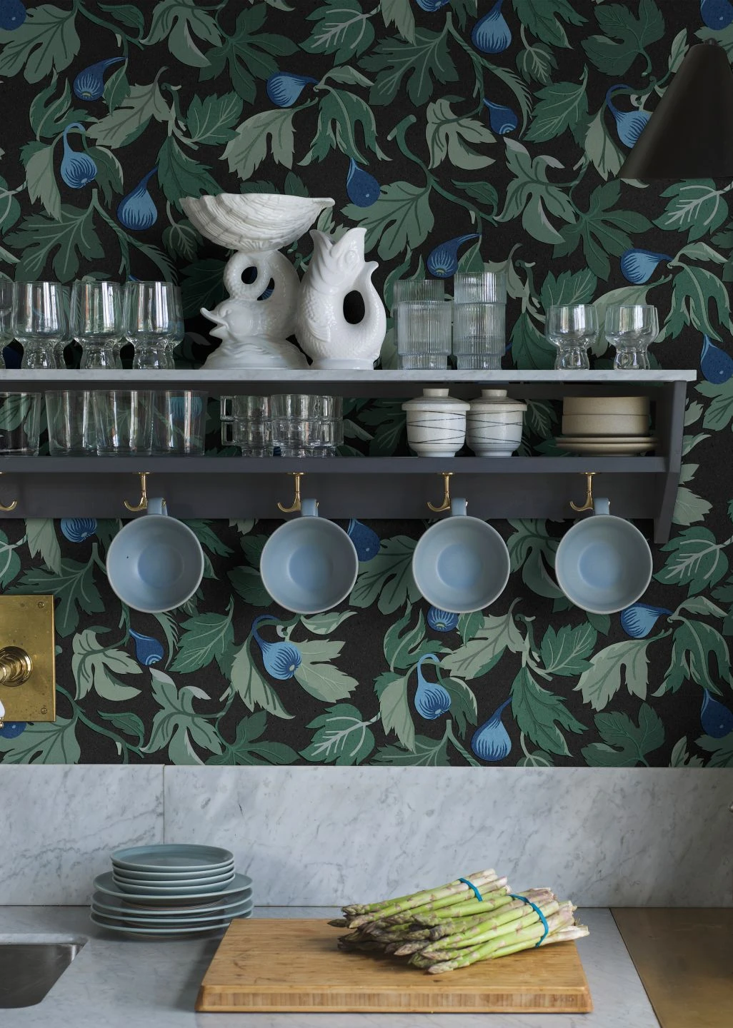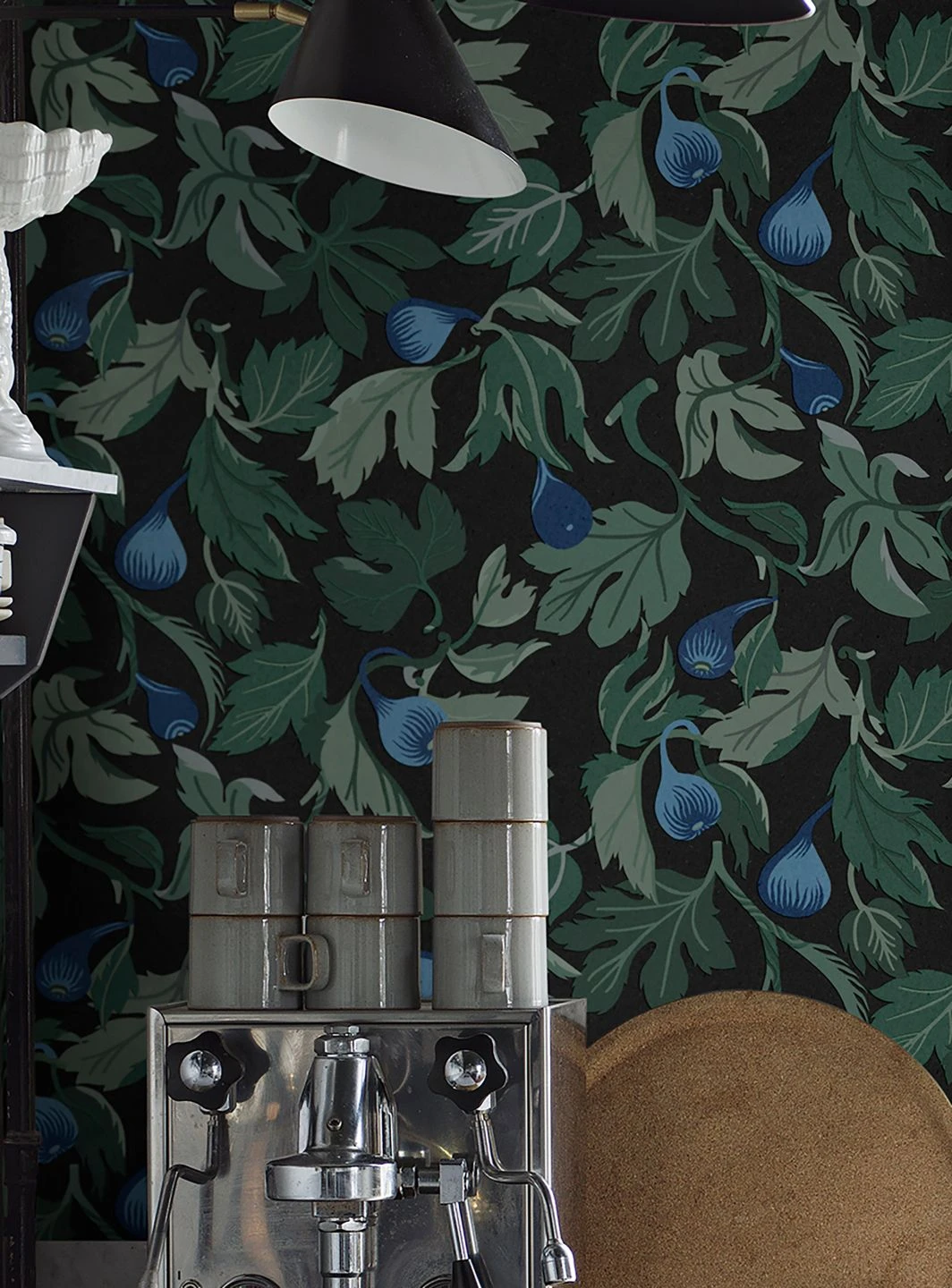 Reife Feigen inmitten kräftiger Feigenblätter entführen Sie in die Region um das Mittelmeer. Geheimnisvoll dunkel ist der Untergrund der Vliestapete, während die Feigen in leuchtendem Blau und Pastellblau zwischen den Grüntönen der Blätter hervorlugen. Je nachdem, wie Sie Ihre Einrichtung wählen, betonen Sie den mediterranen Charakter des Designs oder verleihen dem Landhaus-Stil einen aktuellen, außergewöhnlichen Touch.