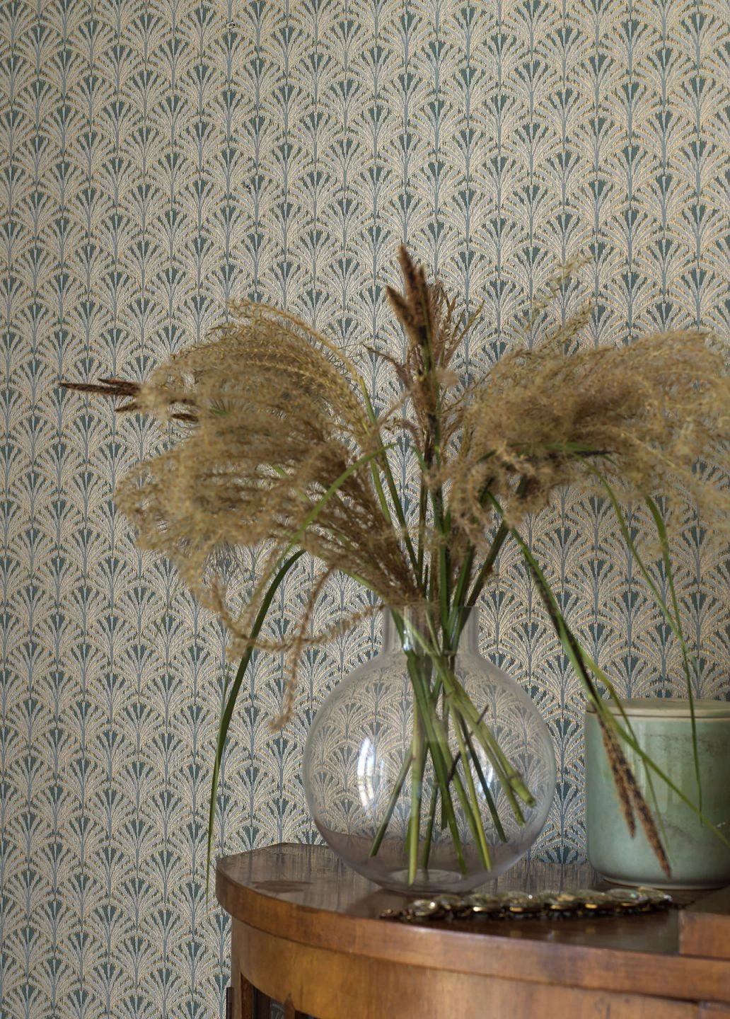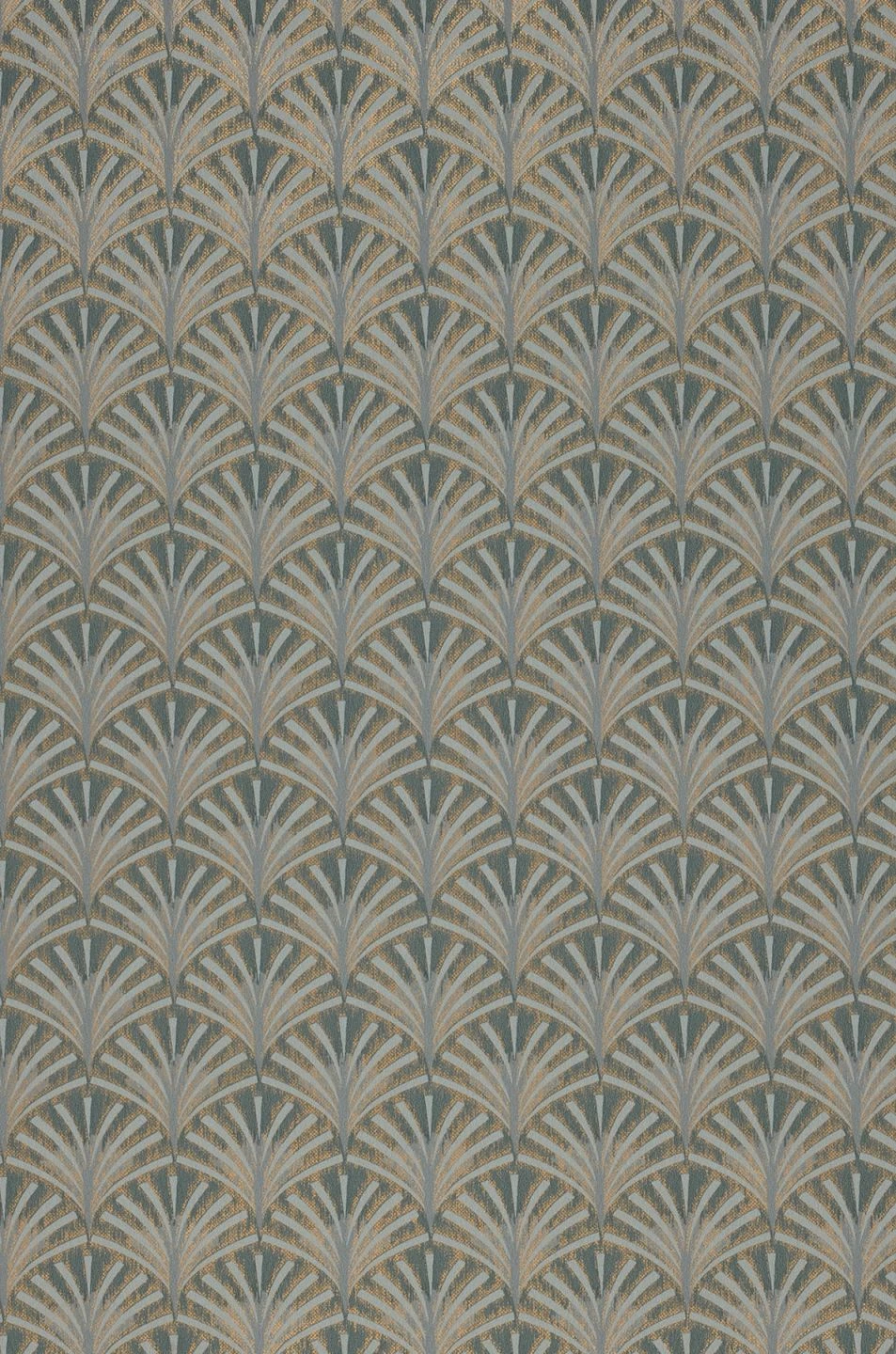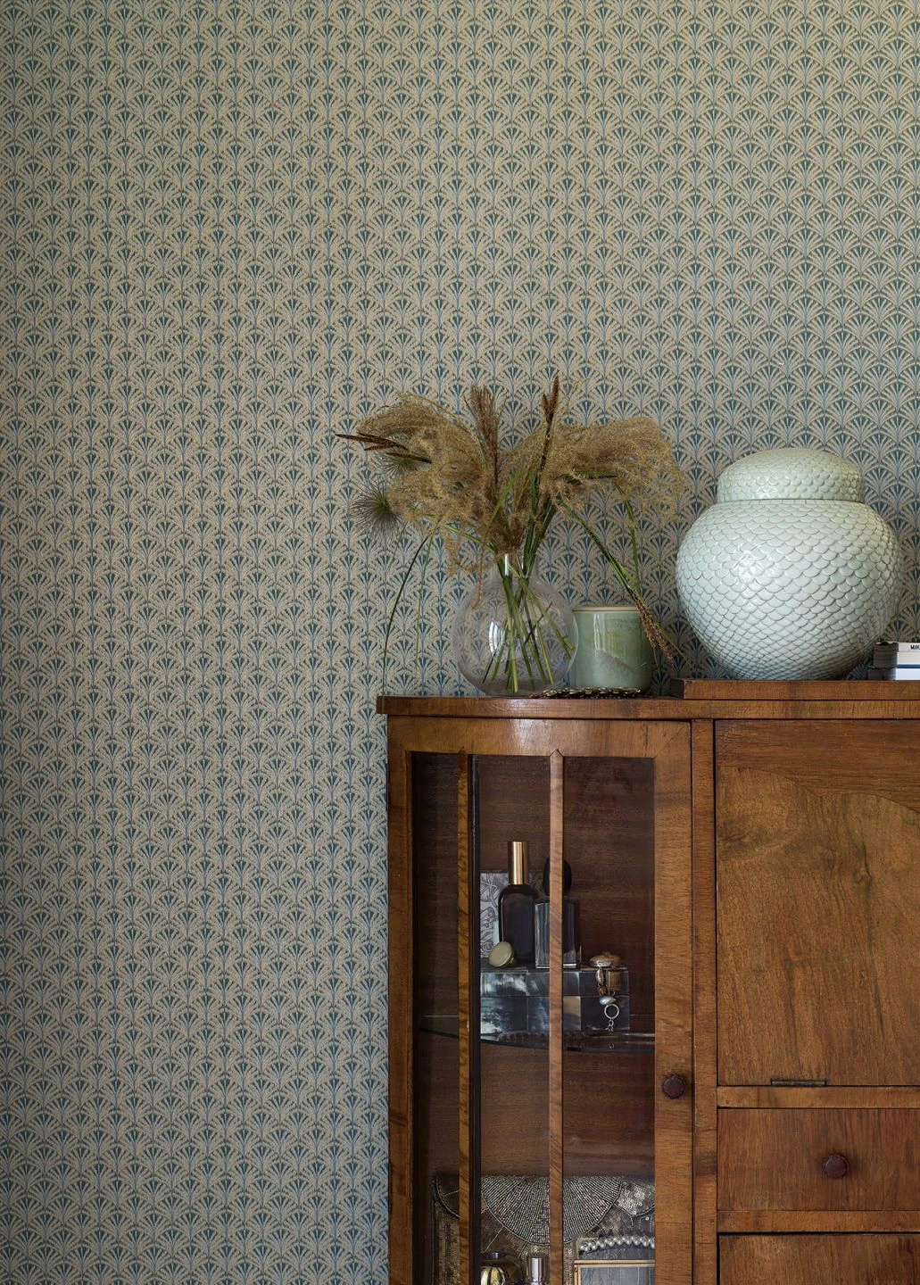 Typisch für das Design des Art Deco sind die fächerförmigen Muster, die die Vliestapete „Mariposa“ zieren. Ein minttürkisfarbener Untergrund mit Musterelementen in Pastelltürkis erhält durch perlgoldene Details einen geheimnisvollen Schimmer. Die Tapete lässt sich wunderbar mit den passenden Wandfarben kombinieren und setzt so einen Akzent in Ihrem Raum. Sie bietet Möbeln im nostalgischen Retro-Stil einen stimmigen Hintergrund.