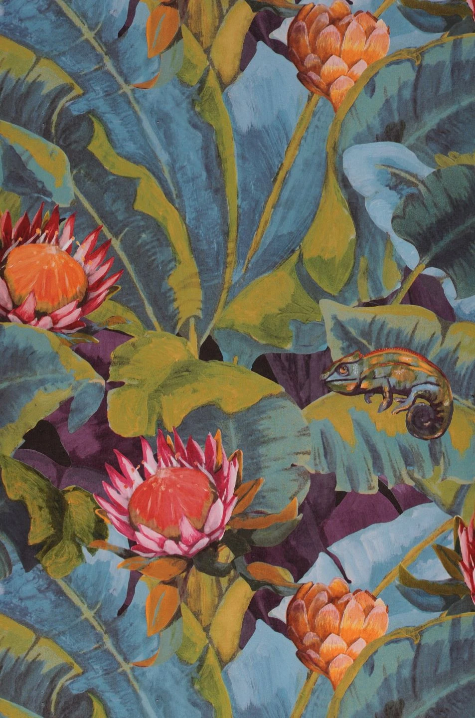 Wie ein ausdrucksstarkes Gemälde zeigt Martinique eine faszinierende tropische Welt aus exotischen Blüten und großen, kräftigen Blättern. Dicht an dicht überwuchern die Pflanzen Ihre Wand und verströmen das Gefühl üppiger Lebendigkeit. Wer genau hinguckt, entdeckt inmitten der Blütenpracht bunt gefärbte Chamäleons. Die faszinierende Tapete lässt sich mit Holztönen, aber auch mit den passenden Farben in Ihrer Einrichtung vielseitig kombinieren.