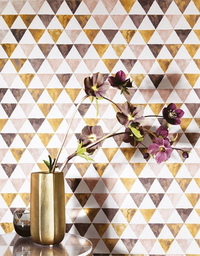 Diese Variante der geometrischen Design Tapete Masell ist von Edelmetallfarben wie Gold, Kupfer, Bronze inspiriert und setzt Dreiecke in Beigerot, Braun, Braunbeige und Cremeweiß durch die bewusst unregelmäßige Auftragetechnik eindrucksvoll in Szene. Die künstlerische Vliestapete spielt mit der Illusion von feinem Metallglanz.