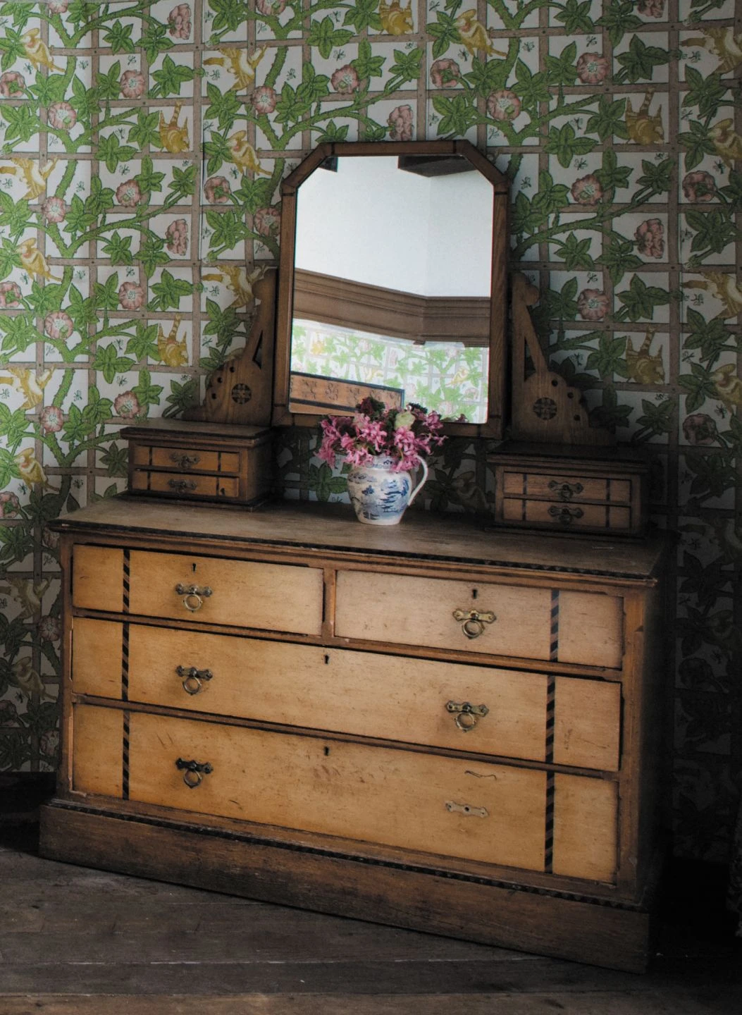 Mit Papiertapete Matilda hat Morris & Co. ein historisches Tapetenmuster des Architekten und Designers Philipp Webb zu neuem, strahlendem Leben erweckt. Stilisierte Heckenrosen ranken sich um ein hölzernes Spalier, auf ihren dornigen Zweigen sitzen Vögel in warmen Gelbtönen, dazwischen vervollständigen Insekten den Eindruck eines Sommertages. Heller als das Originaldesign, gibt Matilda antiken Möbeln in dunklen Holztönen oder Weiß ein zauberhaft sonniges Ambiente.