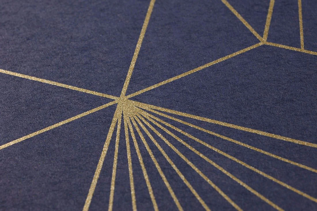 Auf dem tiefem Nachtblau des Untergrunds entstehen aus feinen goldfarbenen Linien klare geometrische Muster: Quadrate, Dreiecke, Trapeze – und immer wieder von einem Punkt ausgehende Strahlen. In der geradlinigen Ästhetik des Art Deco und mit dem stimmungsvollen Zusammenspiel von mattem Blau und schimmerndem Gold ist die Vliestapete ein Genuss für die Augen und eine Kostbarkeit für Ihren Raum.