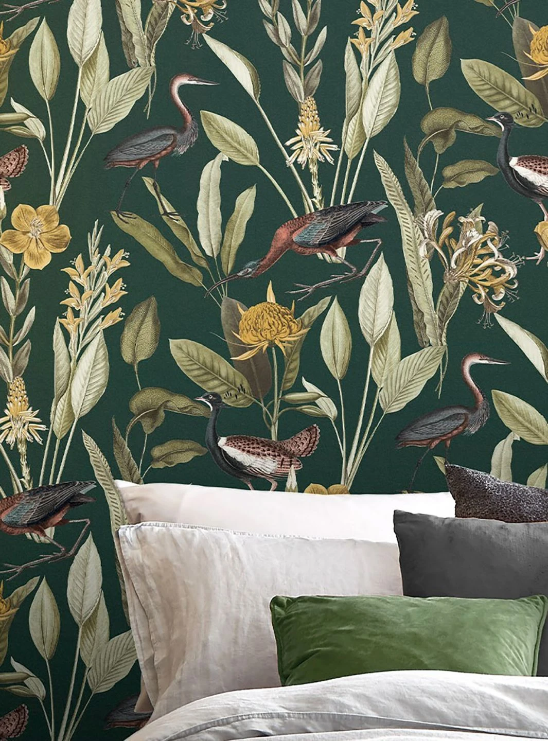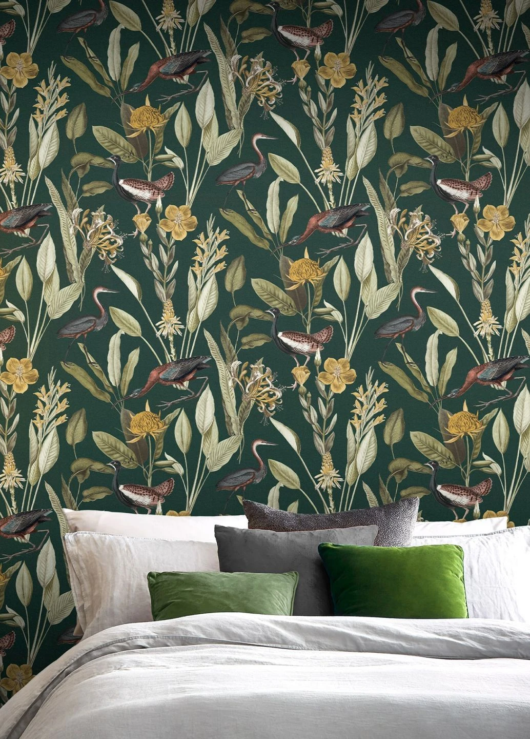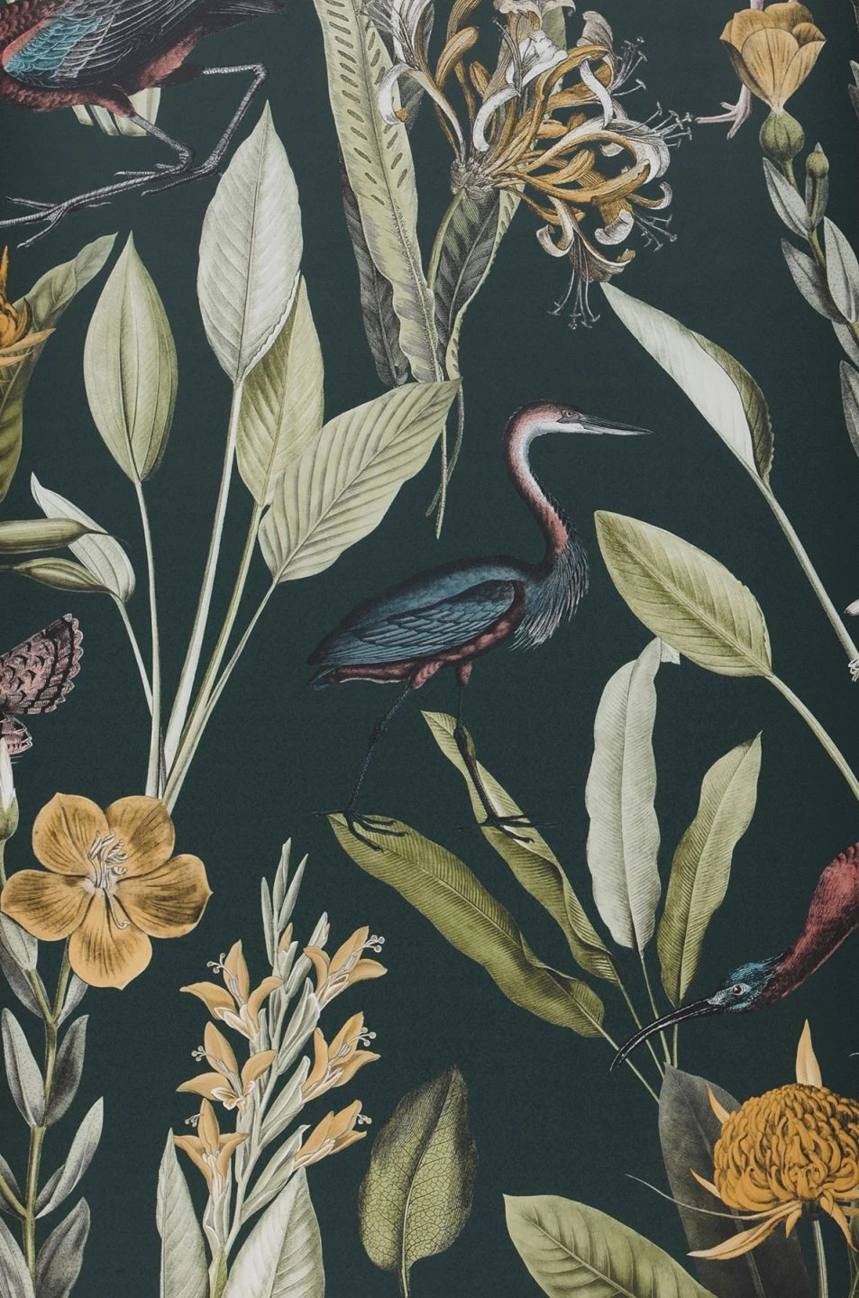 Pflanzen mit prachtvollen Blüten, dazwischen Wasservögel, der Hintergrund tief dunkelgrün: Die Motive auf der Vliestapete „Medina“ wirken wie Illustrationen in einem alten Naturkundebuch, so realistisch scheinen sie. Doch die künstlerische Verfremdung verbirgt sich in den Größenverhältnissen: Da findet ein Reiher auf dem Blatt einer Sumpfpflanze Platz! Ein gewitztes Spiel mit der Tradition der botanischen Tapete und ein Hingucker für jeden Naturliebhaber.