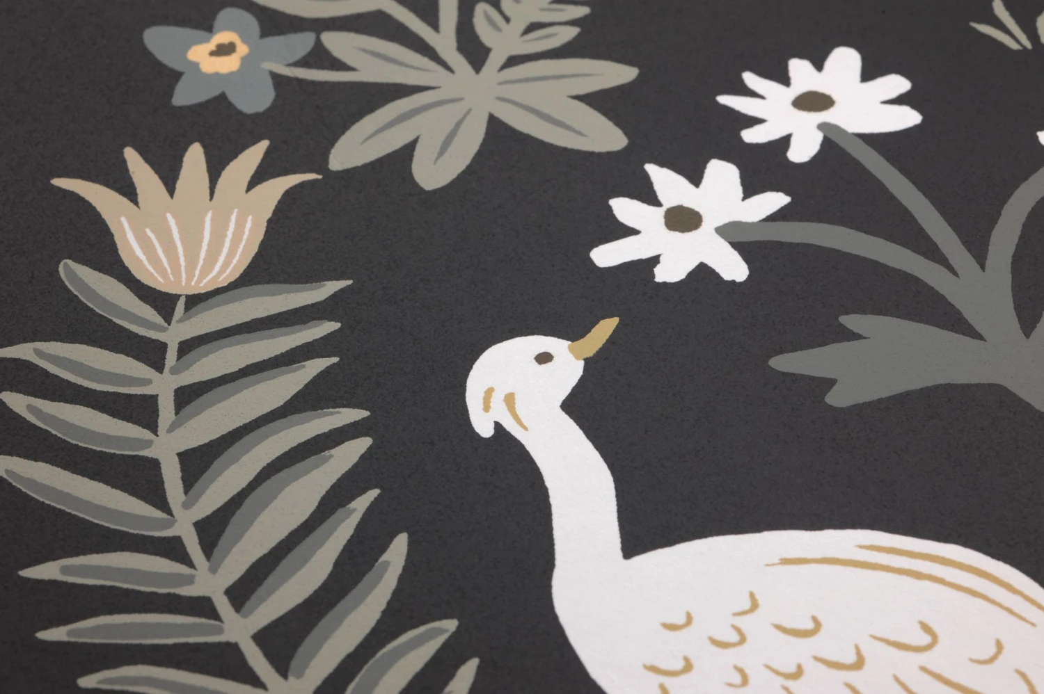 Eine angedeutete Landschaft voller Tiere, Blumen und Bäume, die durch die gedeckten Grautöne, ergänzt um Perlgold und Weiß, sehr geheimnisvoll wirkt. Gleichzeitig entfalten die Farben miteinander eine phantastische Ästhetik, die der Designerfirma Rifle Paper alle Ehre macht. Kombinieren Sie helle Möbel als Kontrast, oder unterstreichen Sie die Welt von Vliestapete Menagerie durch graue oder schwarze Einrichtungselemente.