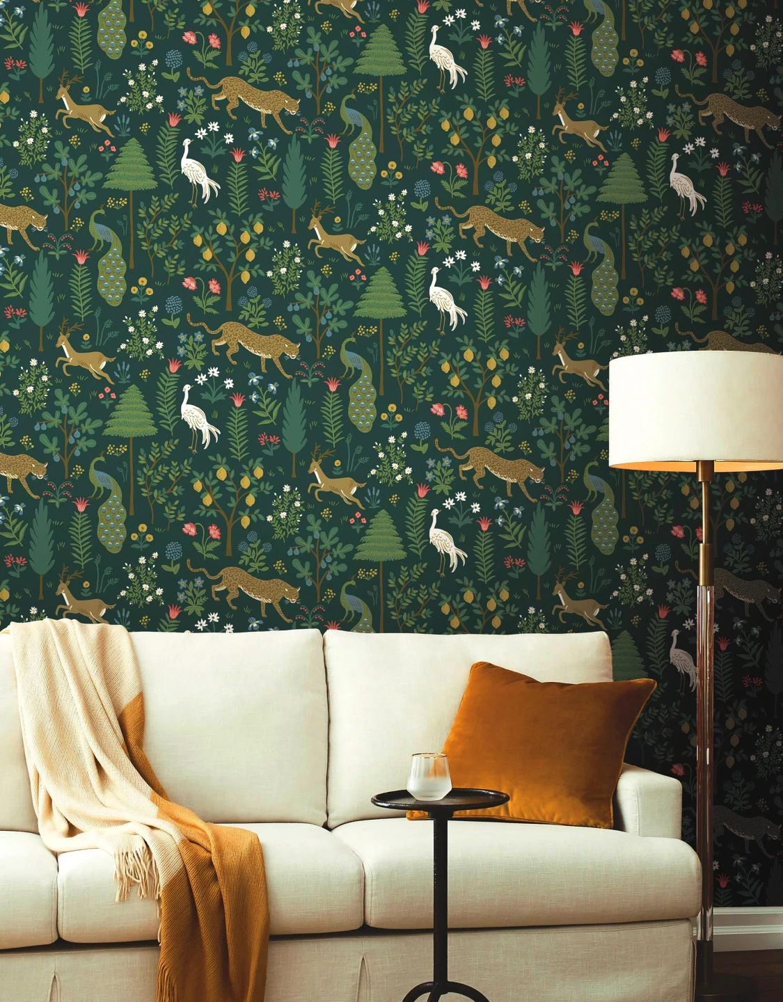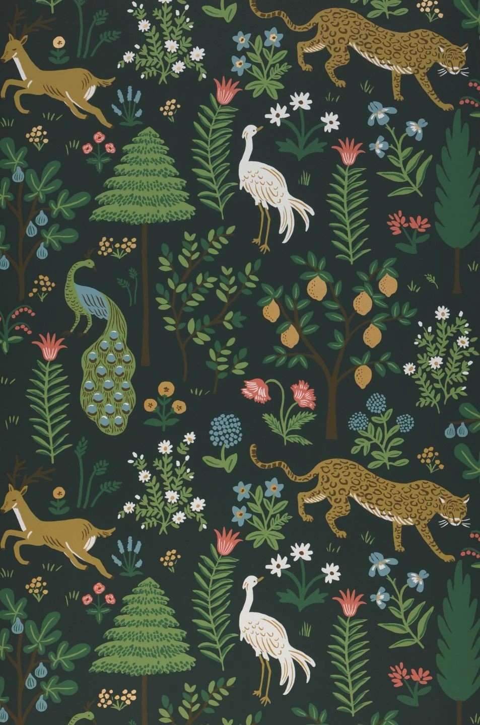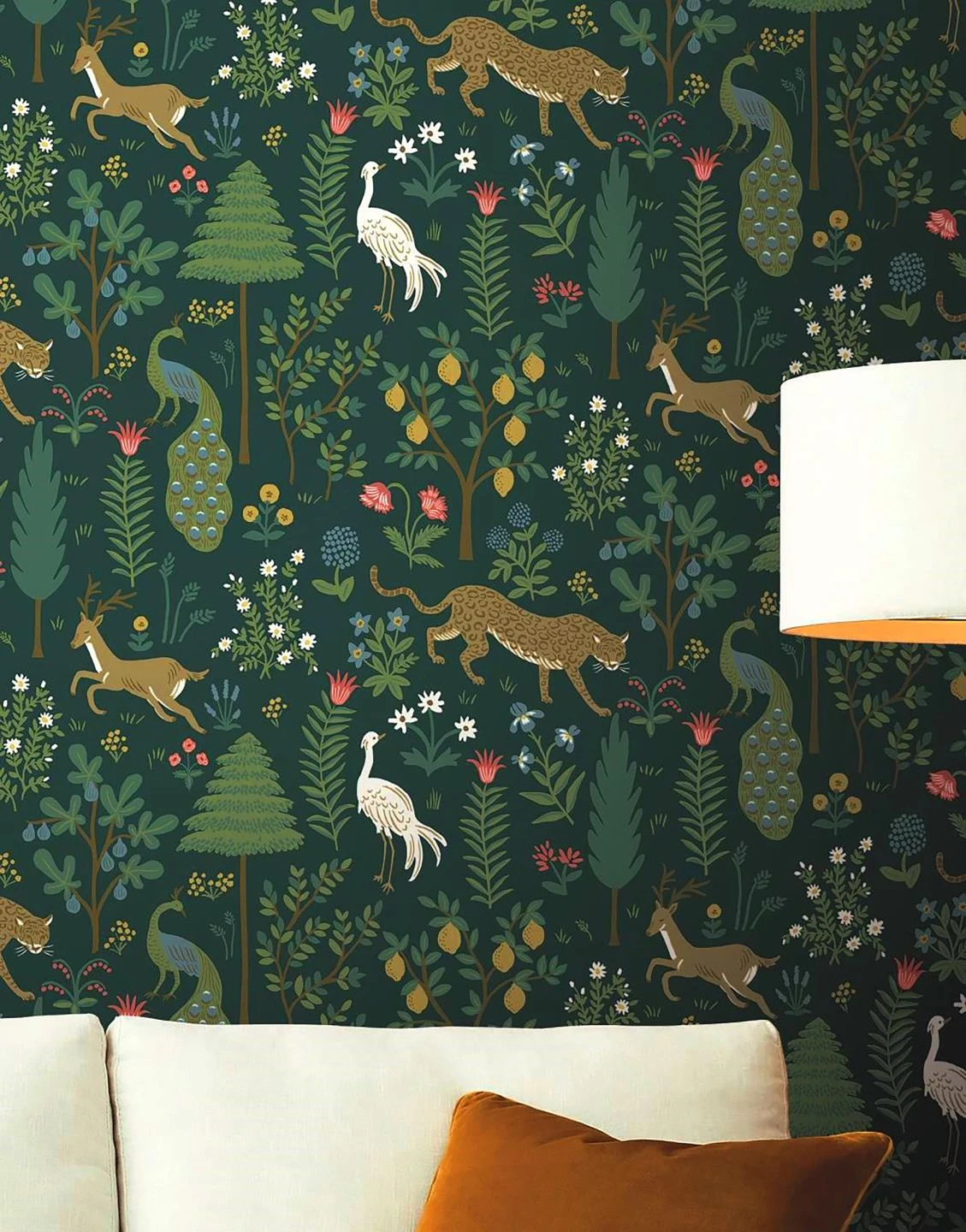 Wie ein handgemaltes Bild wirkt die liebevoll gestaltete Vliestapete Menagerie von Rifle Paper. Bunte Blumen, die in voller Blüte stehen, Bäume mit reifen Früchten, dazwischen verschiedene Tiere: Weiß leuchtende Kraniche, Pfauen, Hirsche und Leoparden leben hier Seite an Seite. Die dunklen Grüntöne geben Menagerie eine Anmutung von Tradition und Nostalgie mit, die unter anderem perfekt zu echten Holzmöbeln passt.
