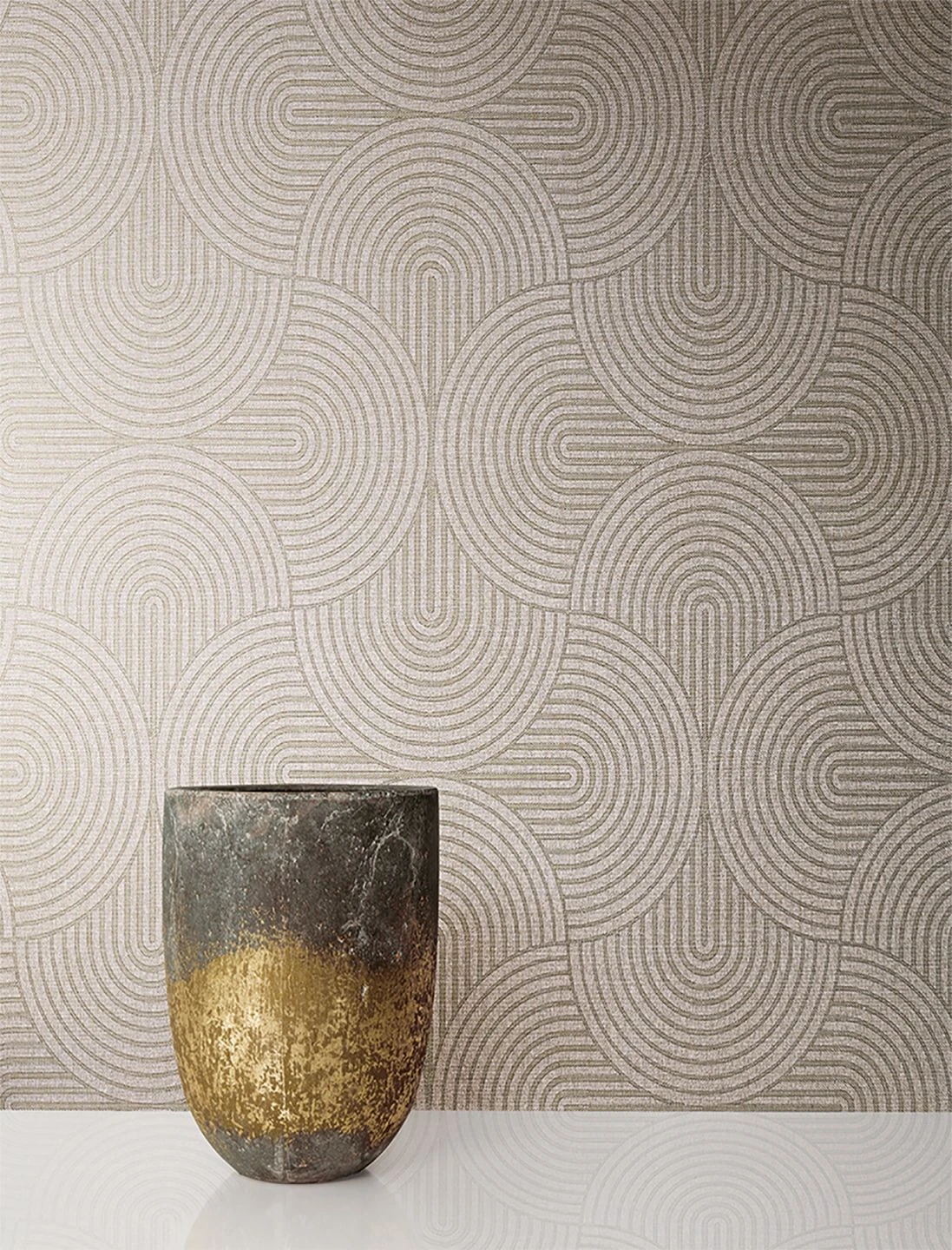 Puristische Geometrie aus weichen runden Formen läuft durch Perlgold-Effekte zu illusionären Hochtouren auf. Genießen Sie das reizvoll-verschlungene Formenspiel, das in der Einrichtung sehr gut mit modernen Hochglanzmöbeln harmoniert. Dekorative Elemente in Antikgold oder Silber bilden eine smarte Verbindung zum unkonventionellen Tapetenmuster.
