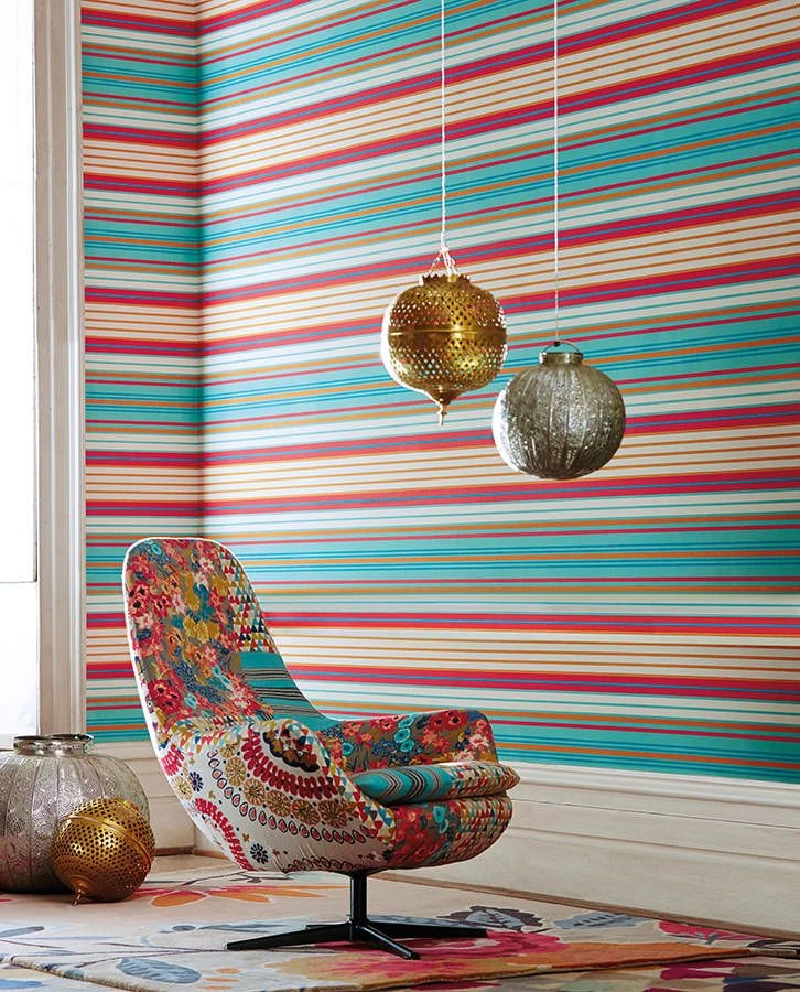 Warme Sonnenstrahlen, eine angenehme kühle Brise und ein erfrischendes Eis – die frischen Rot-, Orange- und Türkistöne wecken Erinnerungen an den letzten Sommerurlaub! Zwischen den klaren Streifen in matter Optik sitzen Sie fast wie unter der Markise eines Eiscafés. Die helle, freundliche Ausstrahlung der Vliestapete lässt auch an nebligen Tagen die Sonne scheinen.