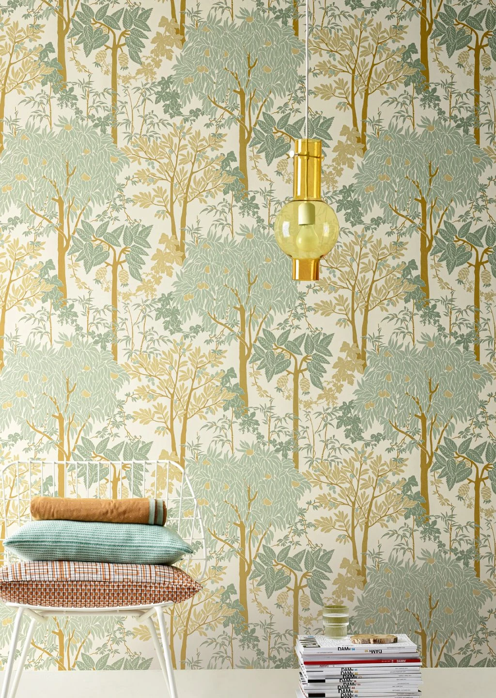 Ein lichter Wald in freundlichen, hellen Grün- und Gelbtönen zaubert eine frühlingshafte Stimmung in Ihren Raum. Schlanke Bäume, dazwischen Unterholz, verschiedene Blattformen und Früchte auf cremeweißem Untergrund geben Ihrem Raum einen einladenden, freundlichen Charakter. Helle Holztöne, Cremefarben, aber auch einer der Farbtöne des Musters ergänzen Ihre Inneneinrichtung zu einem perfekten Gesamtbild.