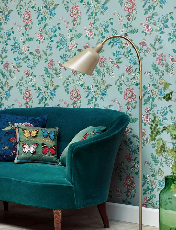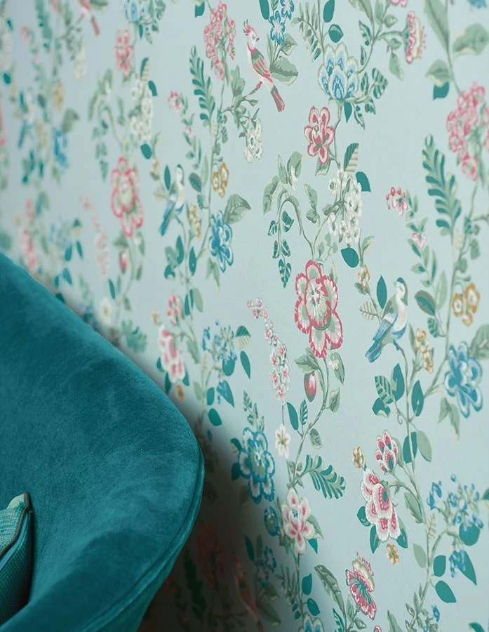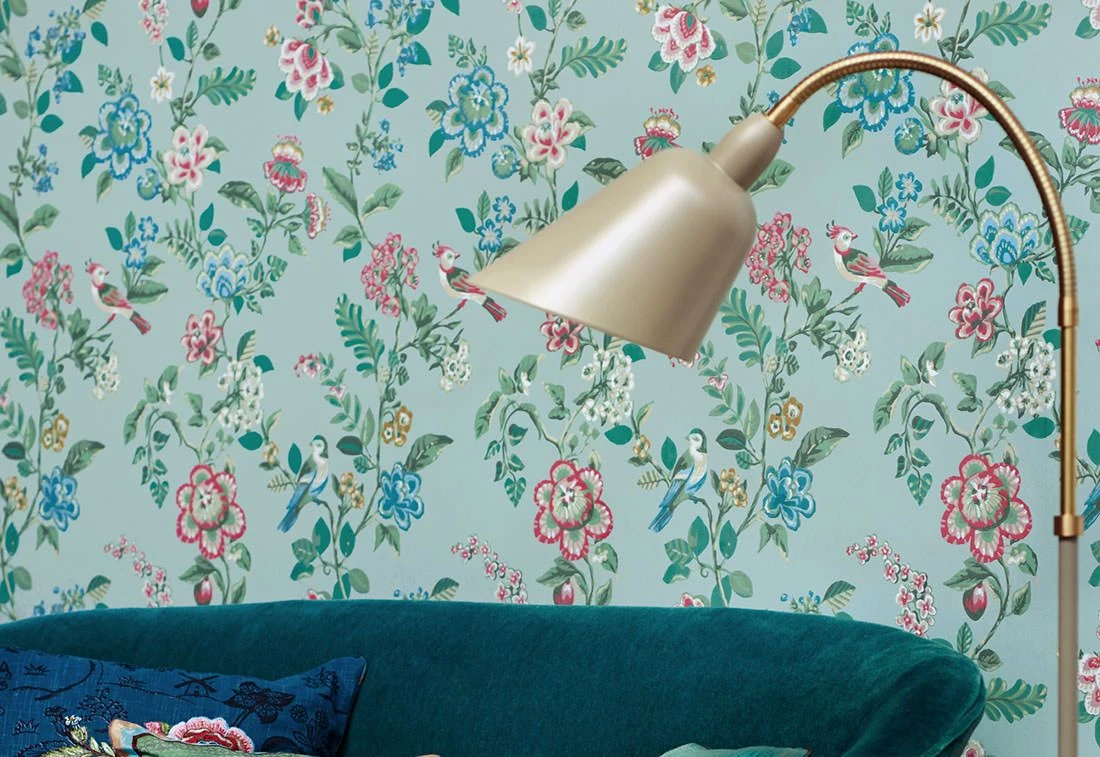 In grüner Harmonie präsentiert sich das außergewöhnlich kontrastreiche Blumenmuster mit bezaubernden Vögeln. Lust auf Farbe, die das Herz öffnet und gleichzeitig wahnsinnig frische Impulse setzt, können Sie mit Design Tapete Miri in Pastelltürkis leicht realisieren.