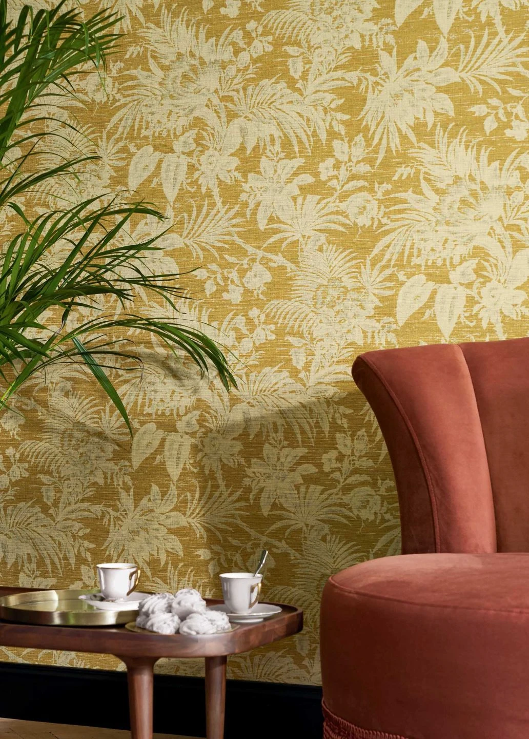 Auf einem leuchtend currygelben Untergrund zeichnen sich schemenhaft cremefarbene exotische Pflanzen ab. Leichte graue Schattierungen lassen die Blumen, Blätter und Zweige leicht plastisch wirken. In die Vinyloberfläche ist eine feine, textilähnliche Struktur eingearbeitet, die ein wenig an einen gewebten Wandbehang erinnert. Gleichzeitig ist die Oberfläche scheuerbeständig und sorgt dadurch auch in Ihrem Badezimmer für sonnige Stimmung bei jedem Wetter.