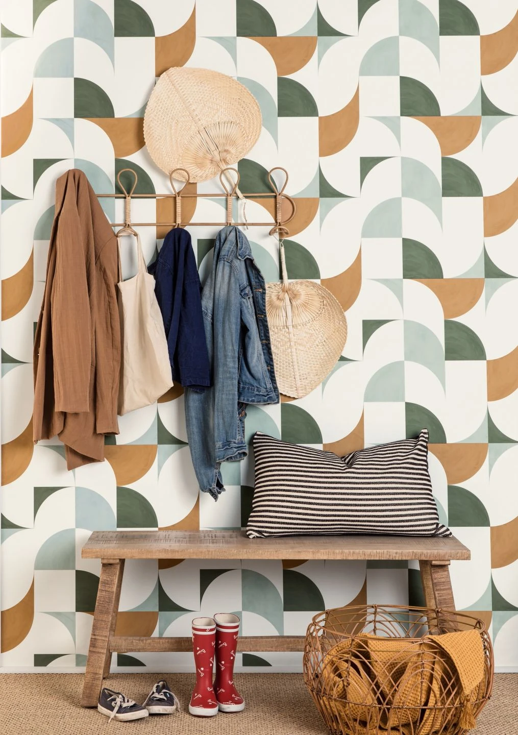 Schwung und Lockerheit bringt die geometrische Tapete Moro mit. Die geschwungenen Linien und die in angenehmem Kontrast stehenden Farben Mintgrau, Olivgrün und Orangebraun sorgen dafür, dass keine Langeweile aufkommt. Mit dem Design peppen Sie Küche, Wohnzimmer oder Flur wirkungsvoll auf oder schaffen ein tolles Ambiente in einem ebenso modernen wie gemütlichen Gastraum. Das Vinyl der Oberfläche ist scheuerbeständig und damit auch fürs Bad perfekt.