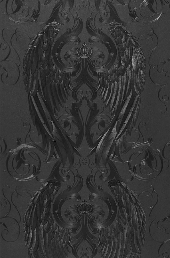 Glamourös und mysteriös zugleich wirken die Kronen und Engelsflügel der schwarzen Tapete Morrigan. Die feine Prägung der Vinyl-Oberfläche erinnert an die Gravur eines luxuriösen Schmuckstücks.