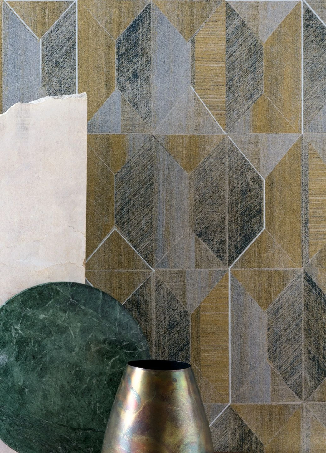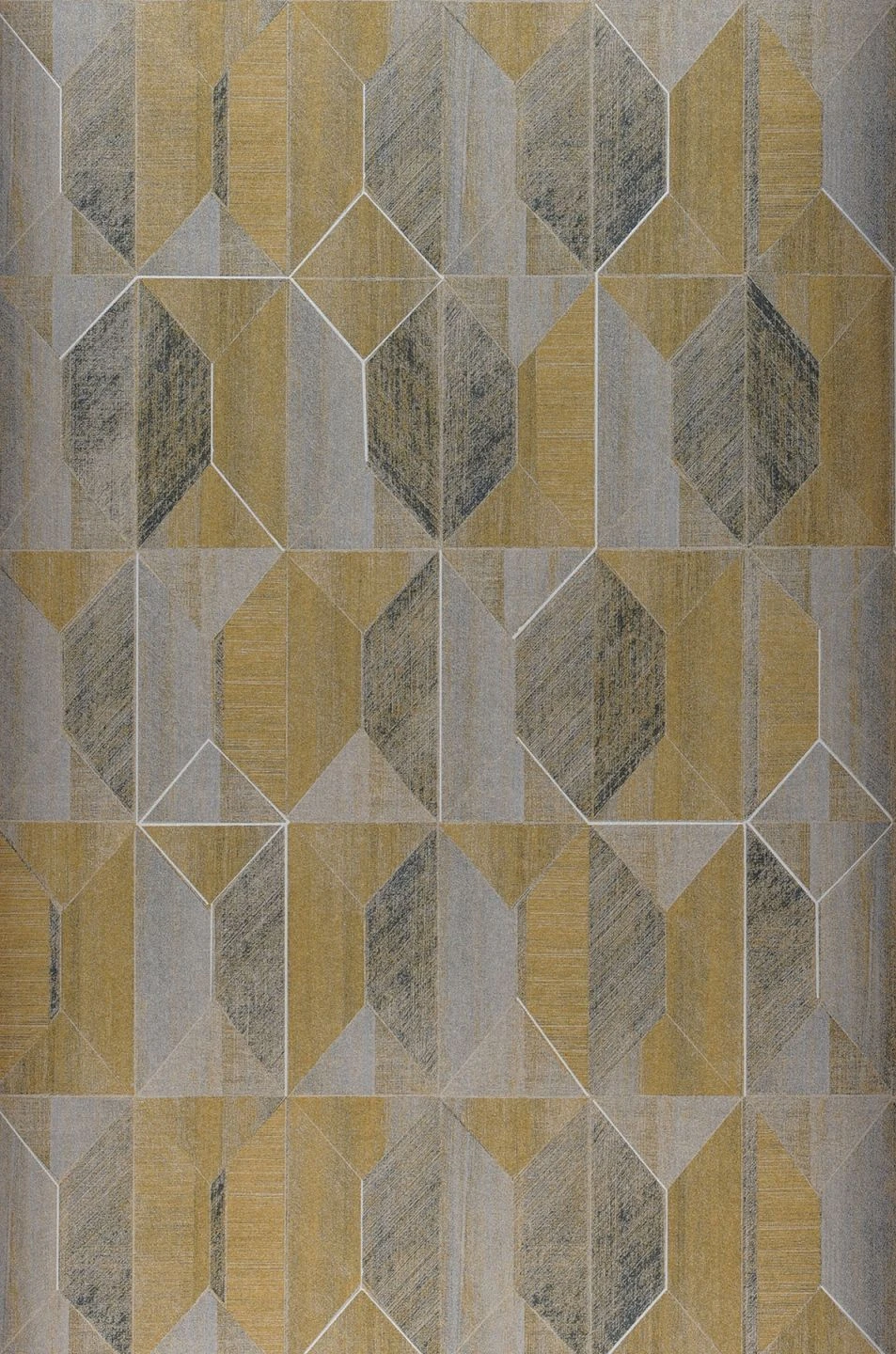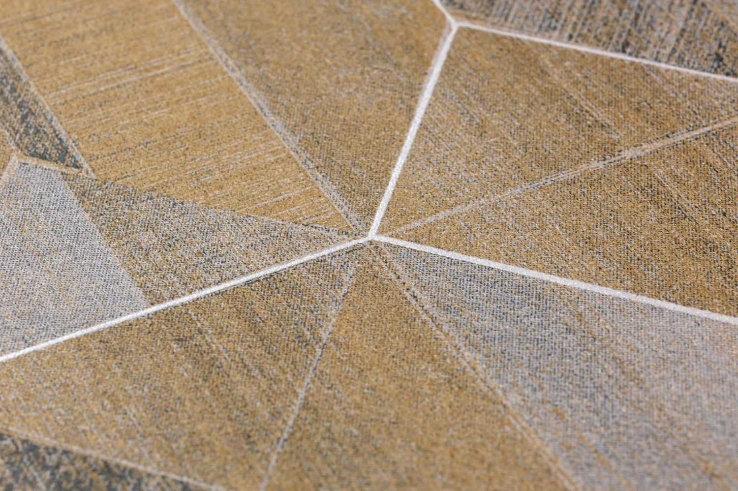 Moderne Geometrie greift zu atypischen Formenmustern, raffinierten Farben und mischt diverse Techniken. Die glatte Vliestapete besticht durch ihre visuelle Struktur, die feine textile Schraffuren mit den außergewöhnlichen Farben Mattgold und Mattsilber kombiniert. Das ermöglicht eine Vielzahl von Lichtfacetten, die optische Effekte hervorrufen.