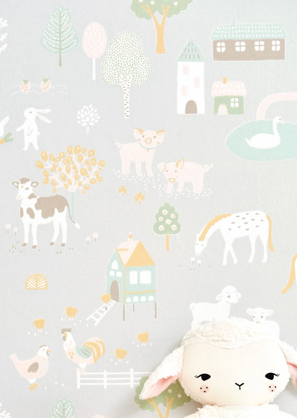 Wie auf einem richtigen Bauernhof gibt es auf dieser Kindertapete aus dem Hause Majvillan viel zu entdecken: Kühe und Pferde, Schweine, Kaninchen und Hühner, Lämmer und sogar Schwäne tummeln sich liebevoll gezeichnet zwischen den Hofgebäuden und den blühenden Bäumen. Das kindgerechte Design und die zarten Farben auf weißgrauem Untergrund sorgen für eine helle, freundliche Stimmung im Kinderzimmer.