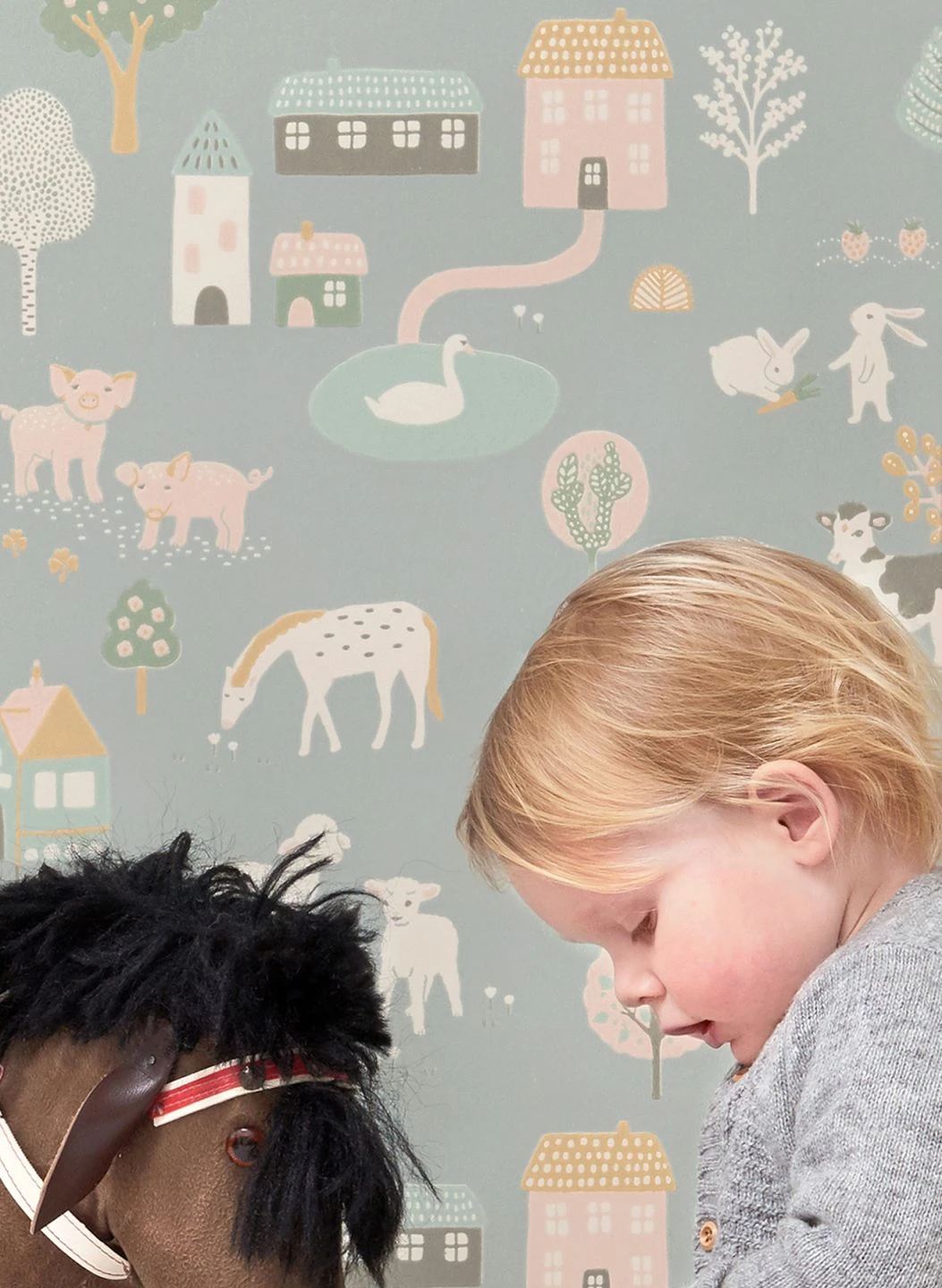 Die vielseitige, lebendige Erlebniswelt eines Bauernhofs hat der schwedische Hersteller Majvillan im Leimdruckverfahren auf eine hochwertige Vliestapete für das Kinderzimmer gebannt. Pferde und Kühe, Schweinchen, Hühner und Schwäne sind in hellen, freundlichen Farben kindgerecht dargestellt. Jedes Kind, das Tiere mag, wird diesen herzerfrischenden, anregenden Wandschmuck in seinem Zimmer lieben.