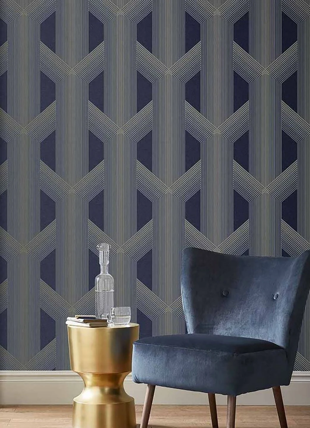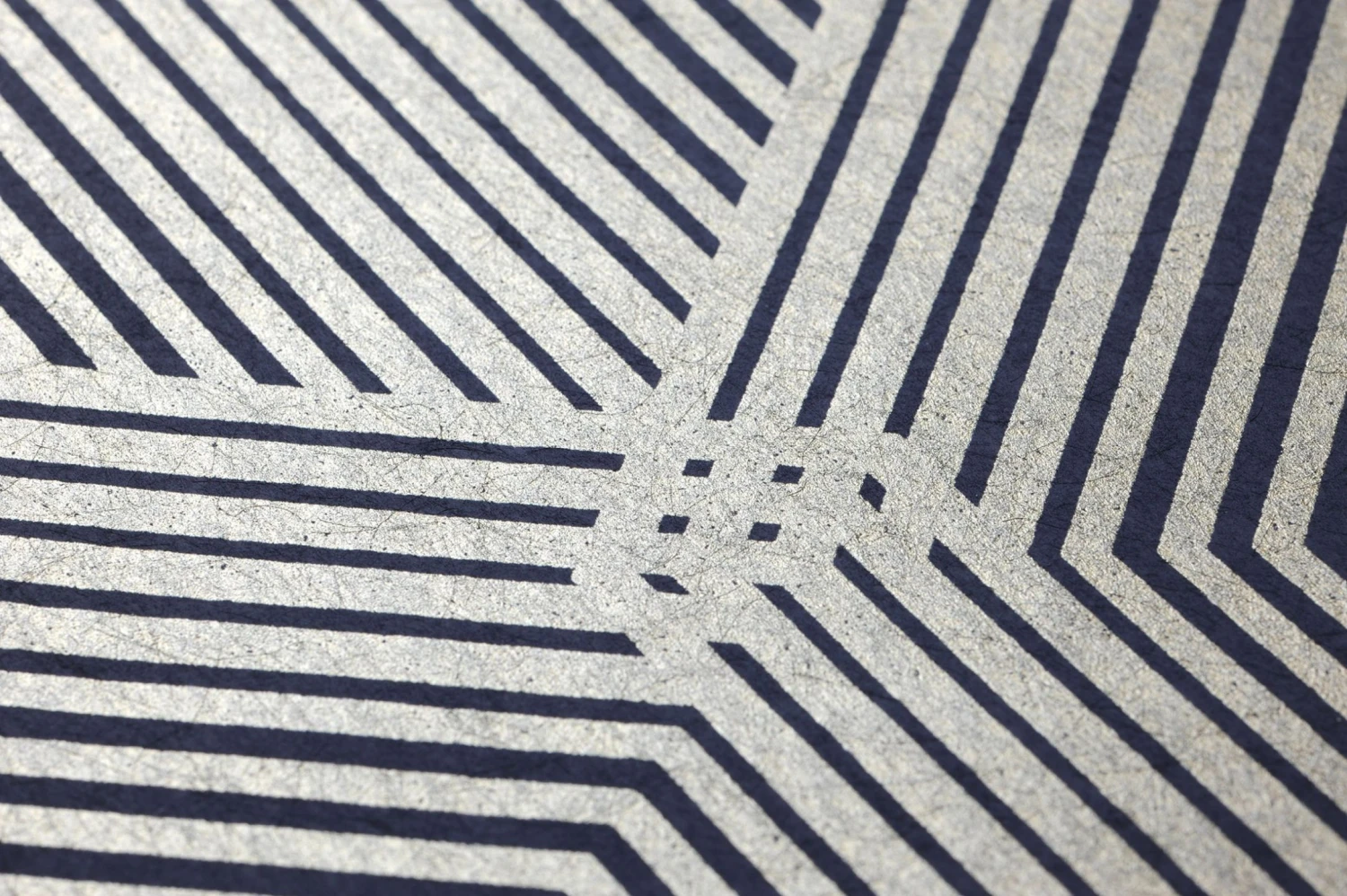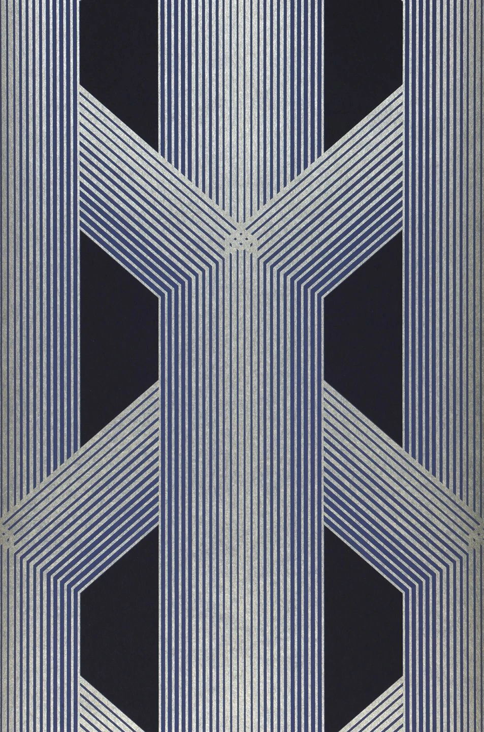 Die Säulen Roms, eingebettet in Hexagonstrukturen zeigen sich hier dem Betrachter ebenso wie ein überdimensionales Flechtgitter, das einen surrealistischen Eindruck vermittelt. Stahlblau verleiht dem Mustermotiv eine weitreichende Tiefe, die sich in der Unendlichkeit verliert. Fein abgestimmt sind die Musterfarben, die durch Silberschimmer einen glamourösen Effekt erhalten.