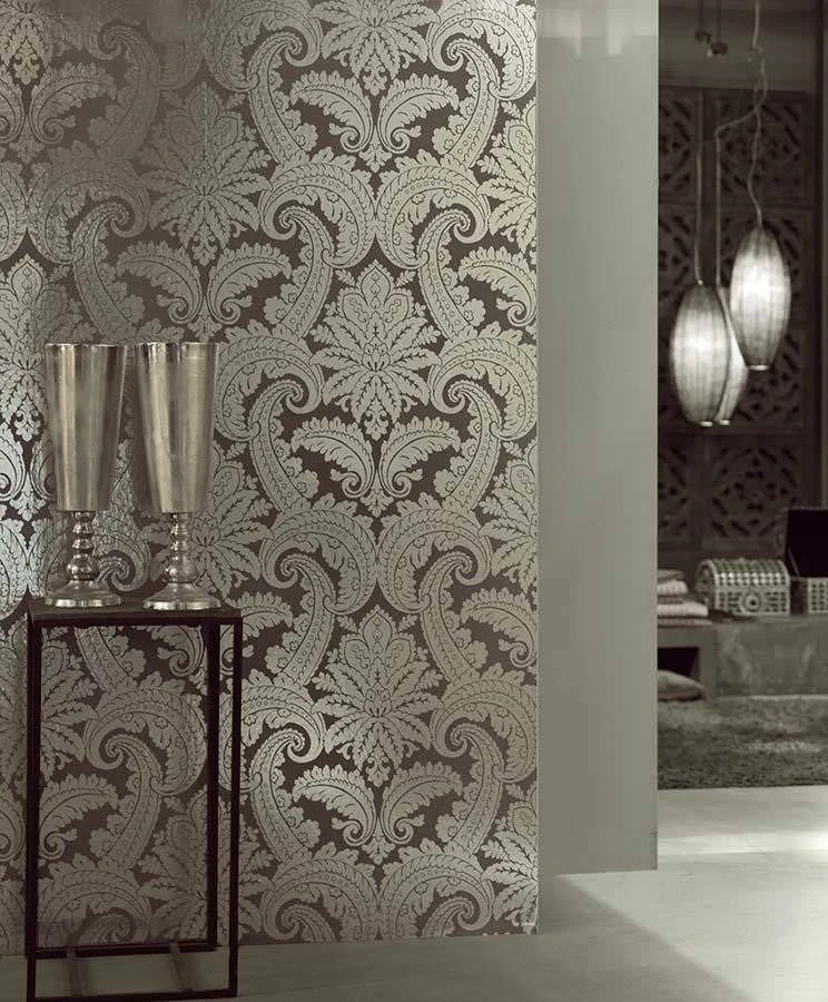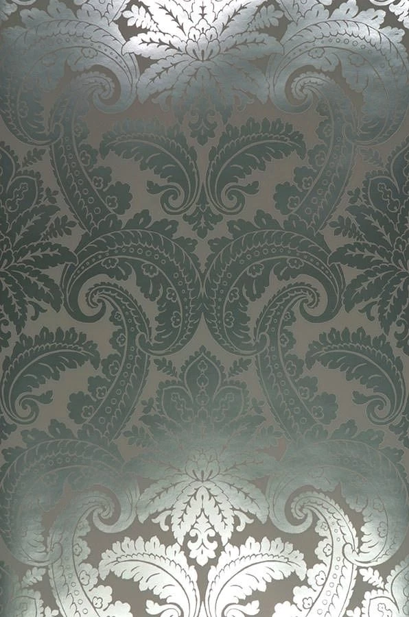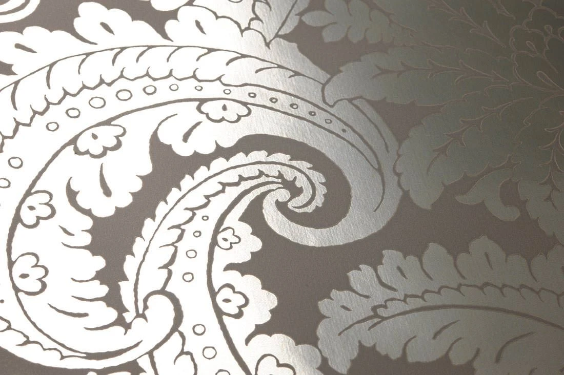 Verschlungene Blattranken und Blüten, die sich zu einem symmetrischen Muster vereinen, geben dieser Tapete die klassische Anmutung einer Barocktapete. Die Besonderheit liegt im Zusammenspiel zwischen dem dezent matten, grauen Untergrund und den silbernen Ornamenten, die aus einer glänzenden Folie mit Metallic-Effekt gearbeitet sind. Der Kontrast zwischen mattem Grund und silbern glänzendem Muster gibt der Tapete Leichtigkeit und Lebendigkeit an Ihren Wänden.