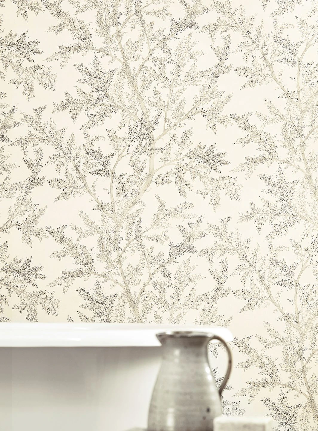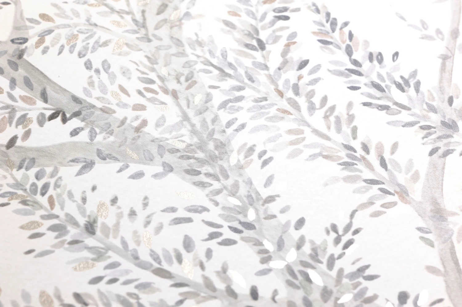 An zarten, wie mit Aquarellfarbe gemalten Ästen und Zweigen sitzen kleine, zierliche Blätter, die mit feinen Pinseltupfern angedeutet sind. Helle Grautöne und schimmerndes Silber auf dem cremeweißen Grund tragen zu der luftigen, leichten Wirkung dieser Vliestapete bei und erzeugen wie glänzendes Laub leichte Lichtreflexe. Mit hellen, grauen oder Holzmöbeln entfaltet die Tapete ihre ganze Eleganz.