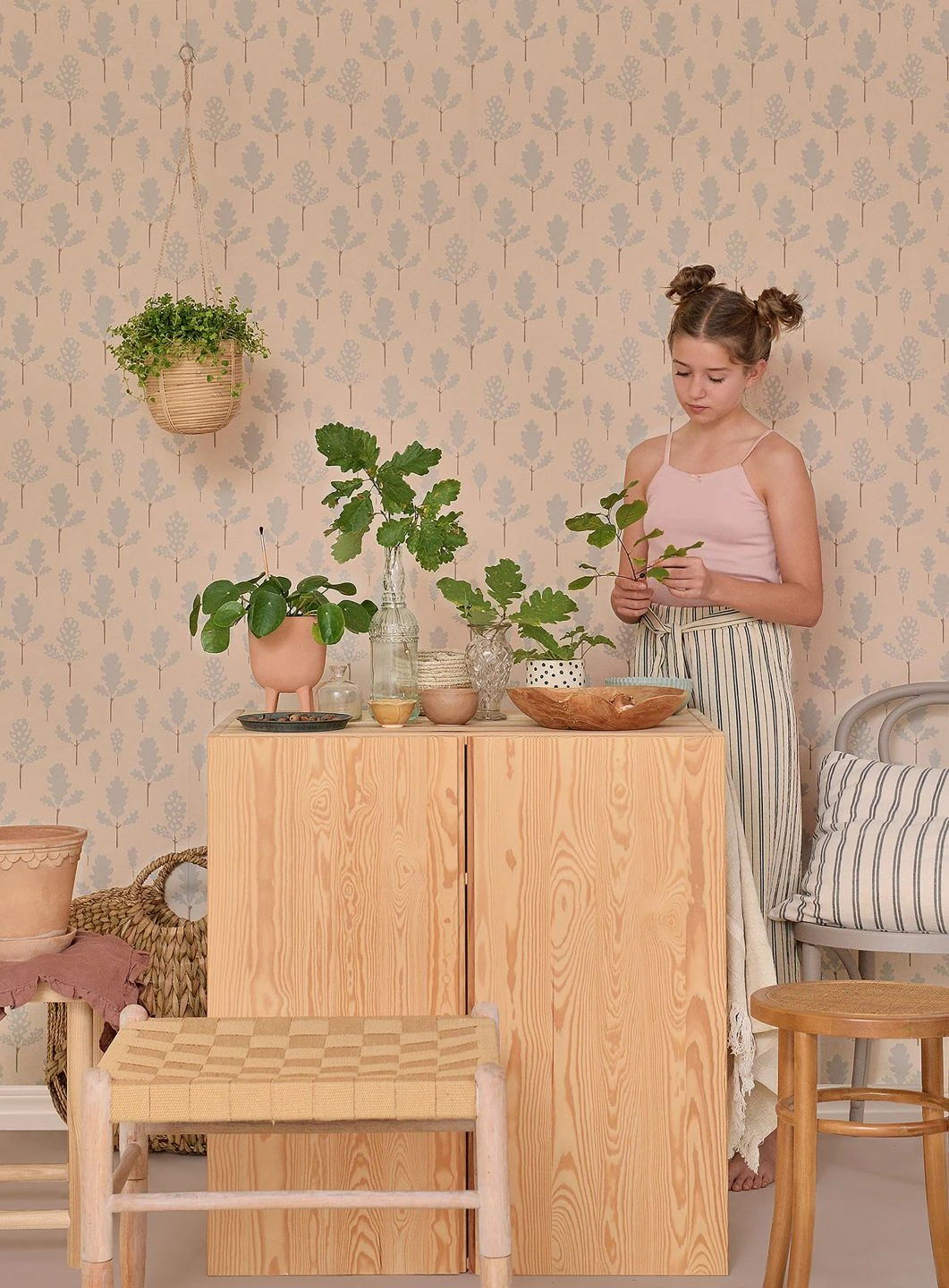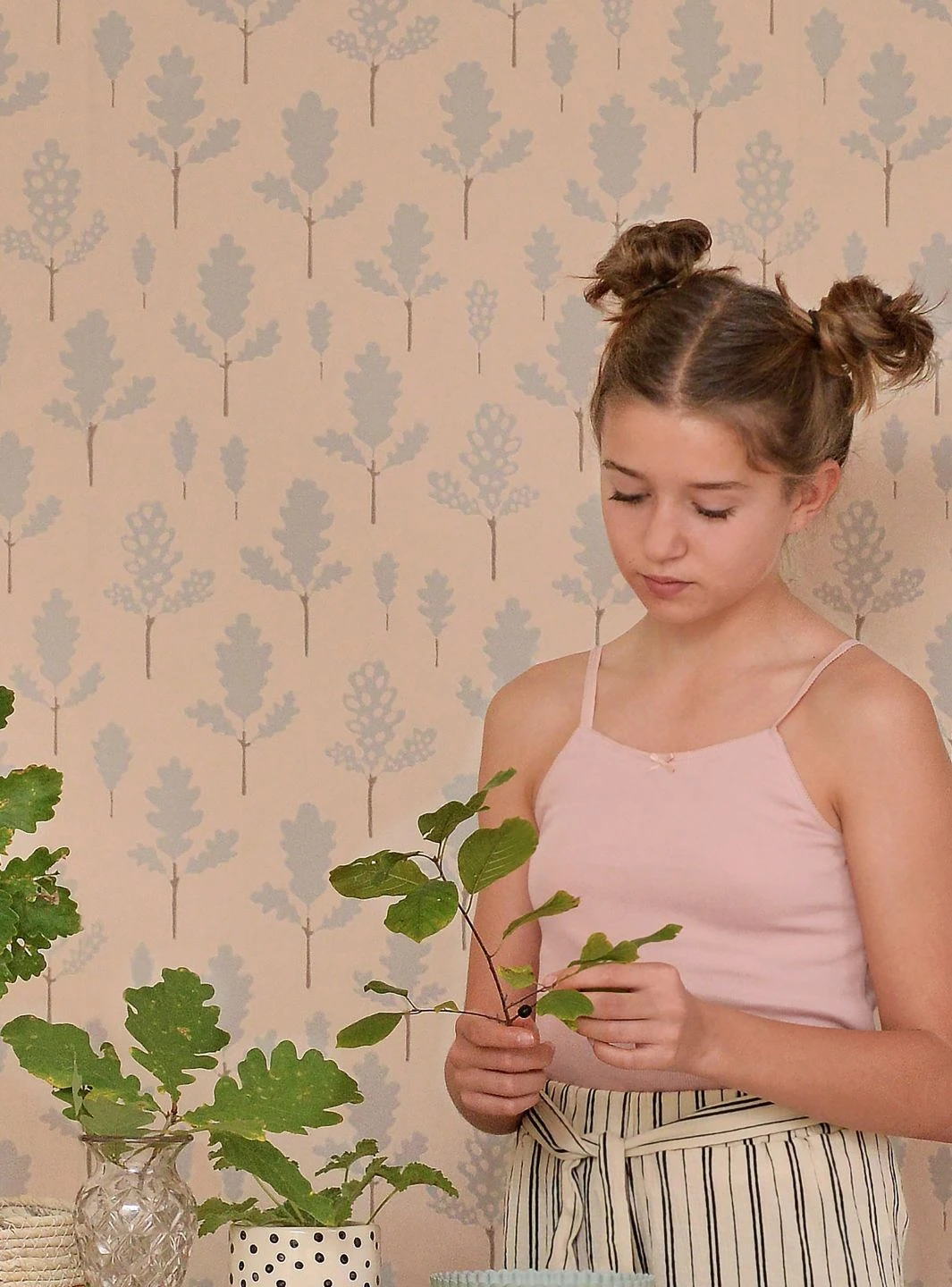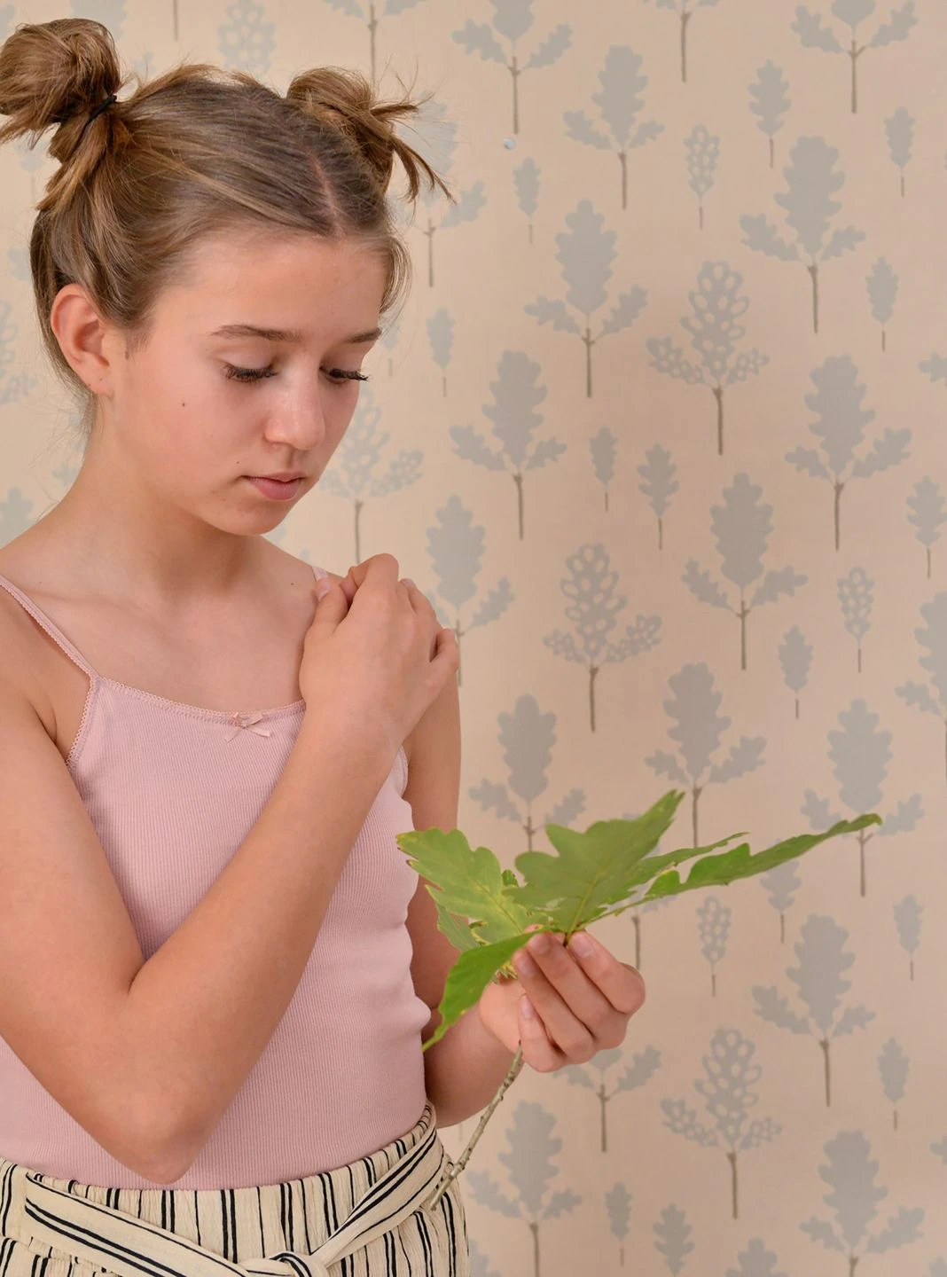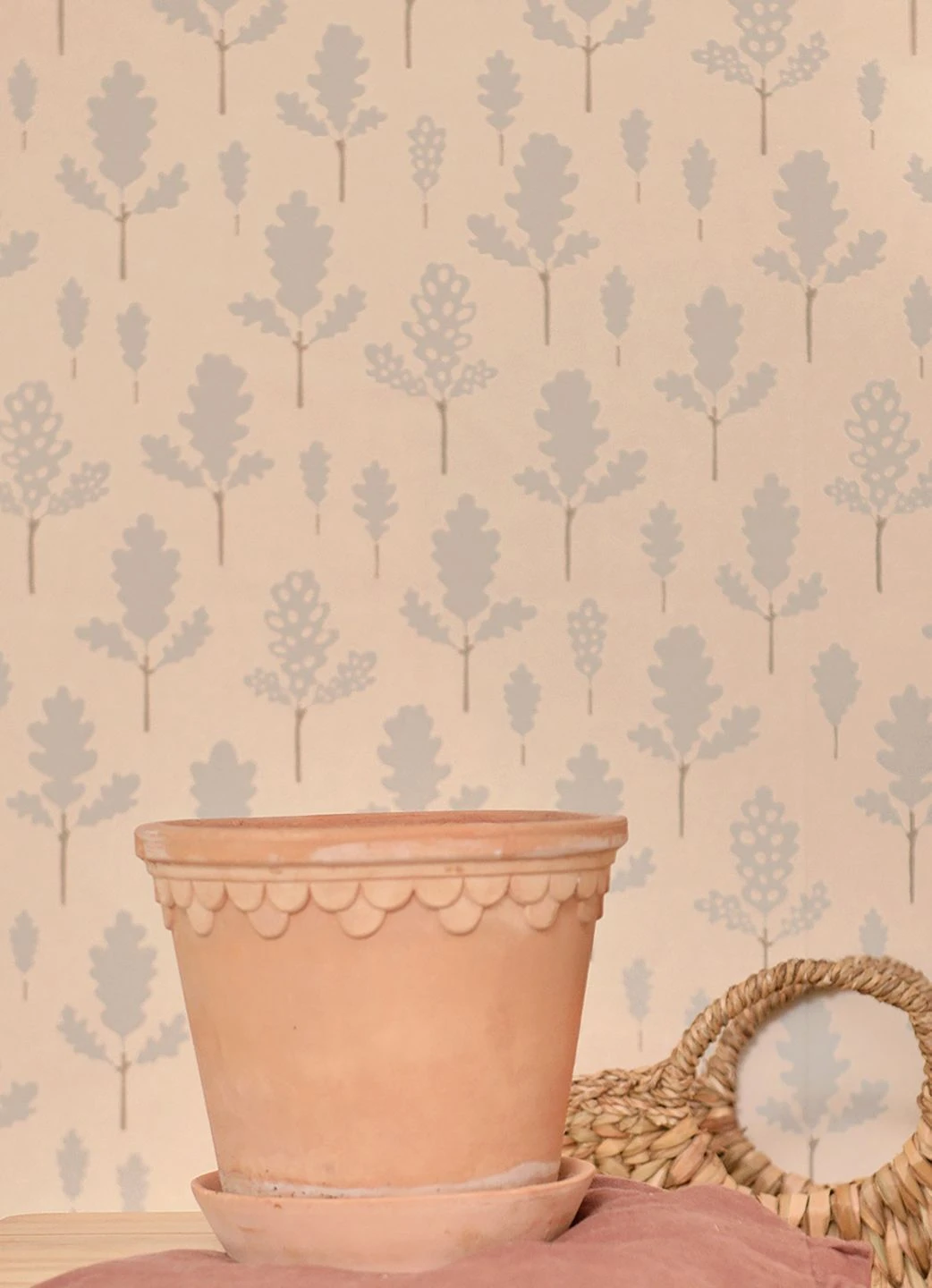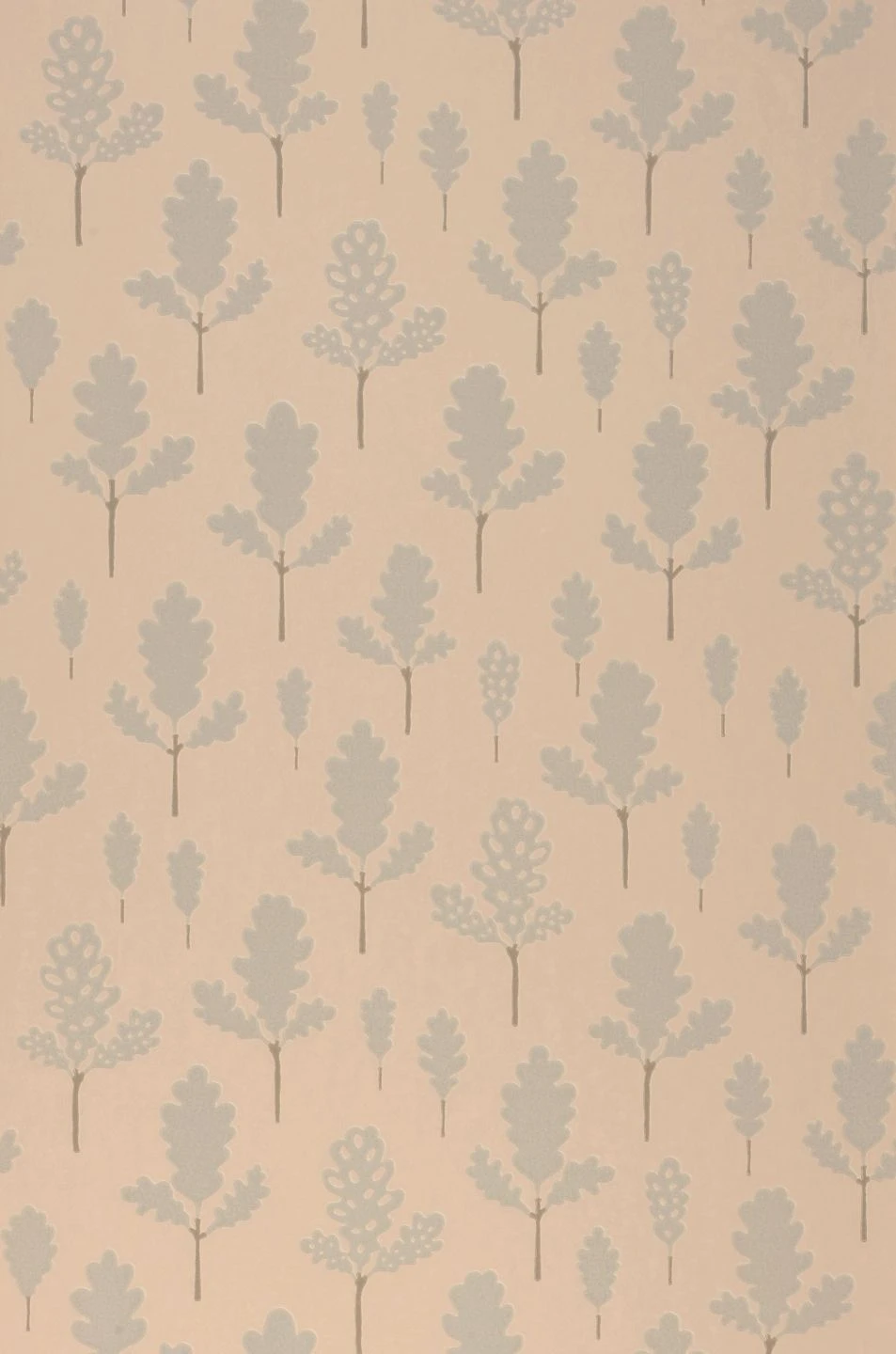 Das Große wiederholt sich im Kleinen. Der Wald aus Eichenbäumen gibt bei näherem Hinsehen sein Geheimnis preis: Was auf den ersten Blick aussieht wie Bäume, sind einzelne Eichenblätter mit ihrer charakteristischen Form. Die pastelltürkisfarbenen Blätter sind im traditionellen Leimdruckverfahren auf den hellbeigefarbenen Untergrund aufgedruckt. Durch den geringen Farbkontrast strahlt die Tapete von Majvillan die Ruhe eines tiefen Waldes aus.
