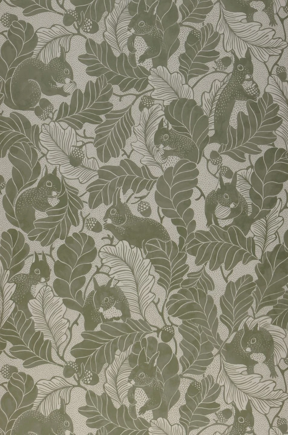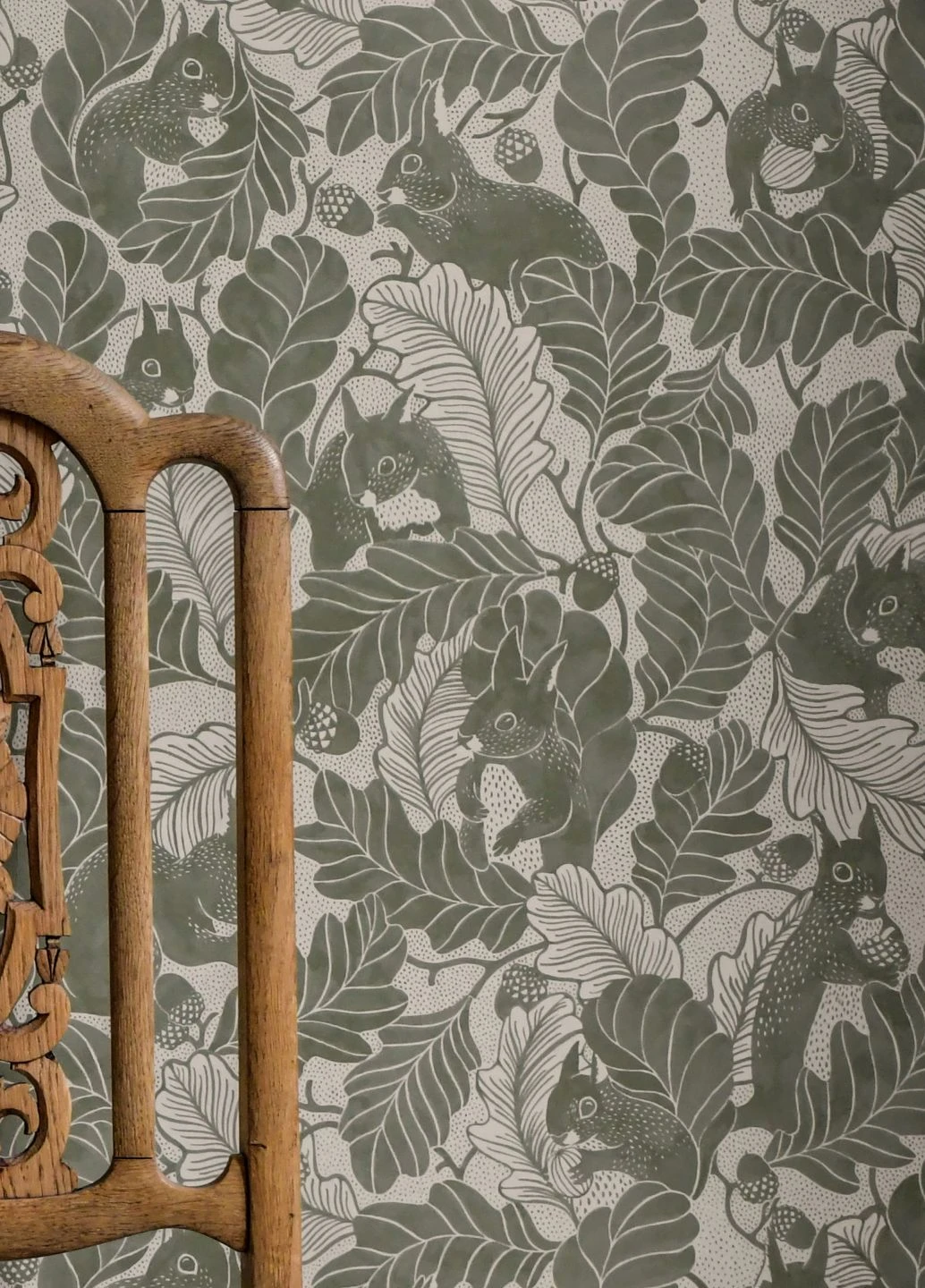 Eichhörnchen verstecken sich in den Zweigen der Eichen. Die Darstellung des Tapetenmusters trägt ihr Teil zu ihrer Tarnung bei: Durch die Konzentration auf ein blasses Olivgrün als Musterfarbe und durch die Form ihrer buschigen Schwänze, die von den Eichenblättern kaum zu unterscheiden sind, laden sie den Betrachter zu einem kleinen Suchspiel ein. In Verbindung mit Holzmöbeln im skandinavischen oder Vintage-Stil ist Oak Tree Tails ein besonders schöner Hintergrund für Ihren Raum.