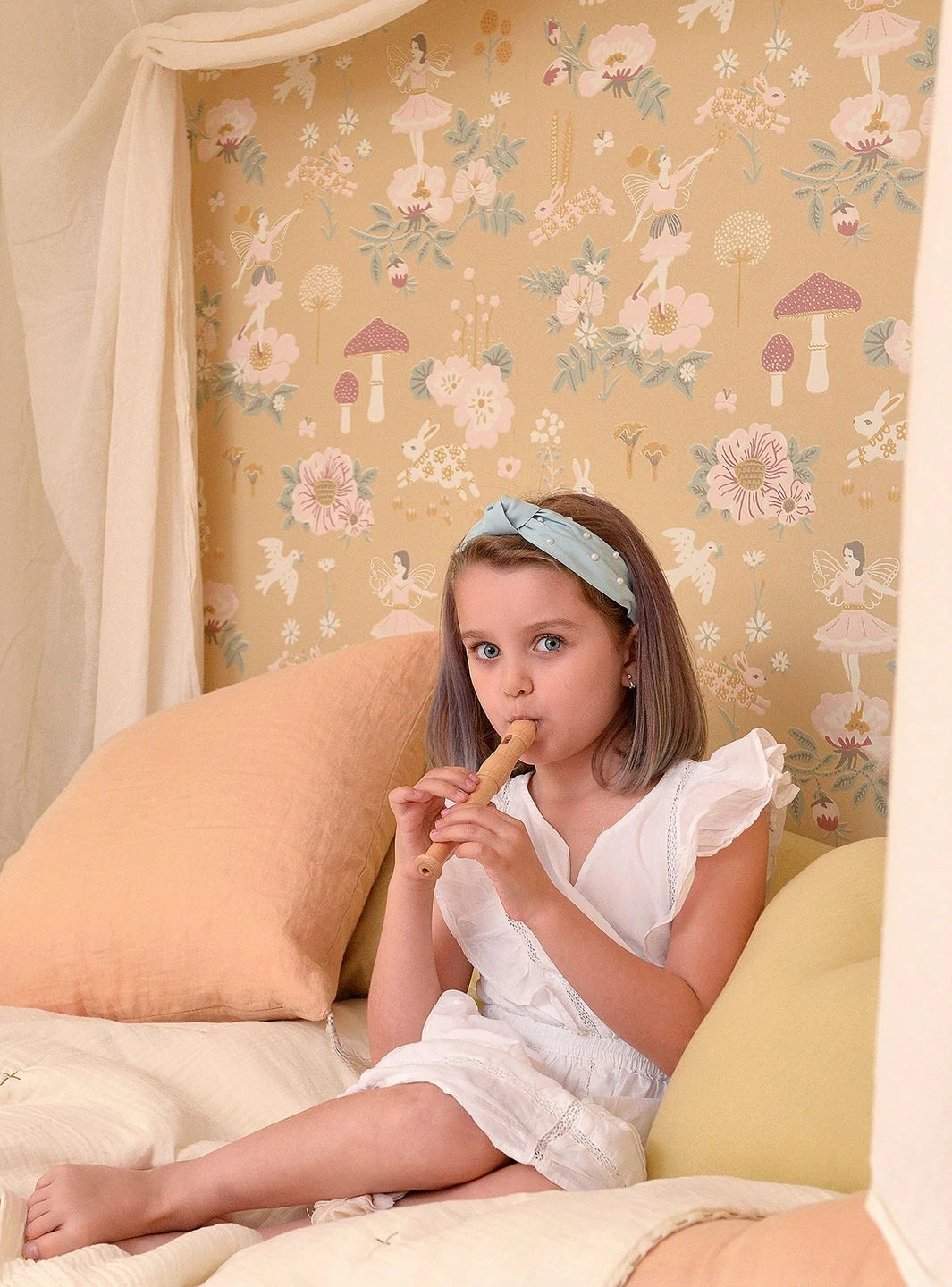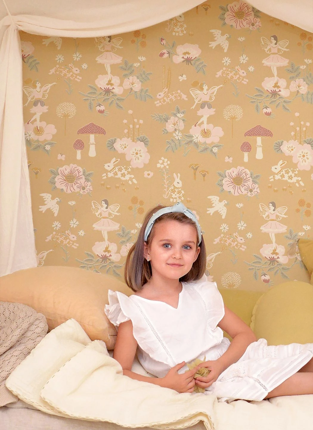In ein wahres Märchenland verwandelt die Tapete „Old Garden“ des schwedischen Herstellers Majvillan das Kinderzimmer. Zwischen Blumen und Pilzen sind Feen, Hasen, Tauben und Schmetterlinge zu entdecken. Der Zauber, der von den kindgerechten Illustrationen ausgeht, gewinnt noch an Ausstrahlung durch das verwendete Leimdruckverfahren. Die Farben Hellrosa, Minttürkis, Ocker, Weinrot und Weiß schaffen mit dem beigefarbenen Untergrund ein harmonisches Gesamtbild.