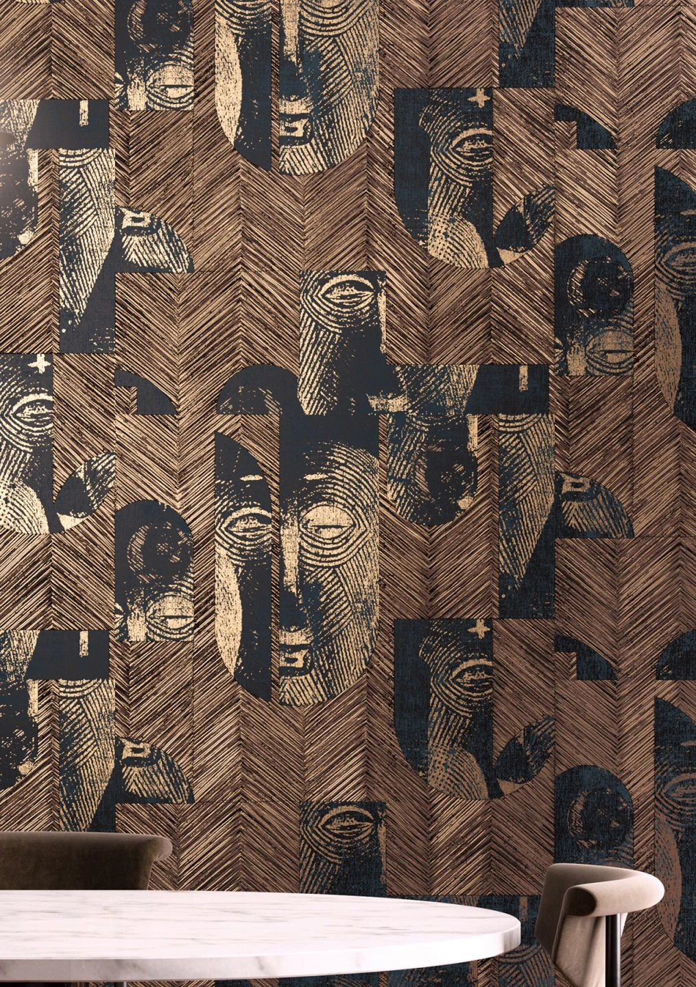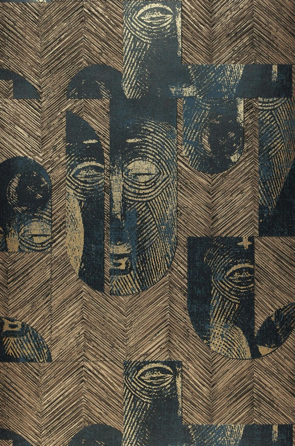 Ein spannendes Muster-Puzzle aus afrikanischen Maskenteilen, verfeinert in Linien- und Fischgrätoptik, die plastische Wirkeffekte hervorruft – Das ausdrucksstarke Tapetendesign setzt den Africain-Stil sehr modern und rough um, was auch an den Musterfarben Gold Schimmer, Grünblau, Schwarz liegt. Es regt zum Nachdenken an, ohne zu beschweren.