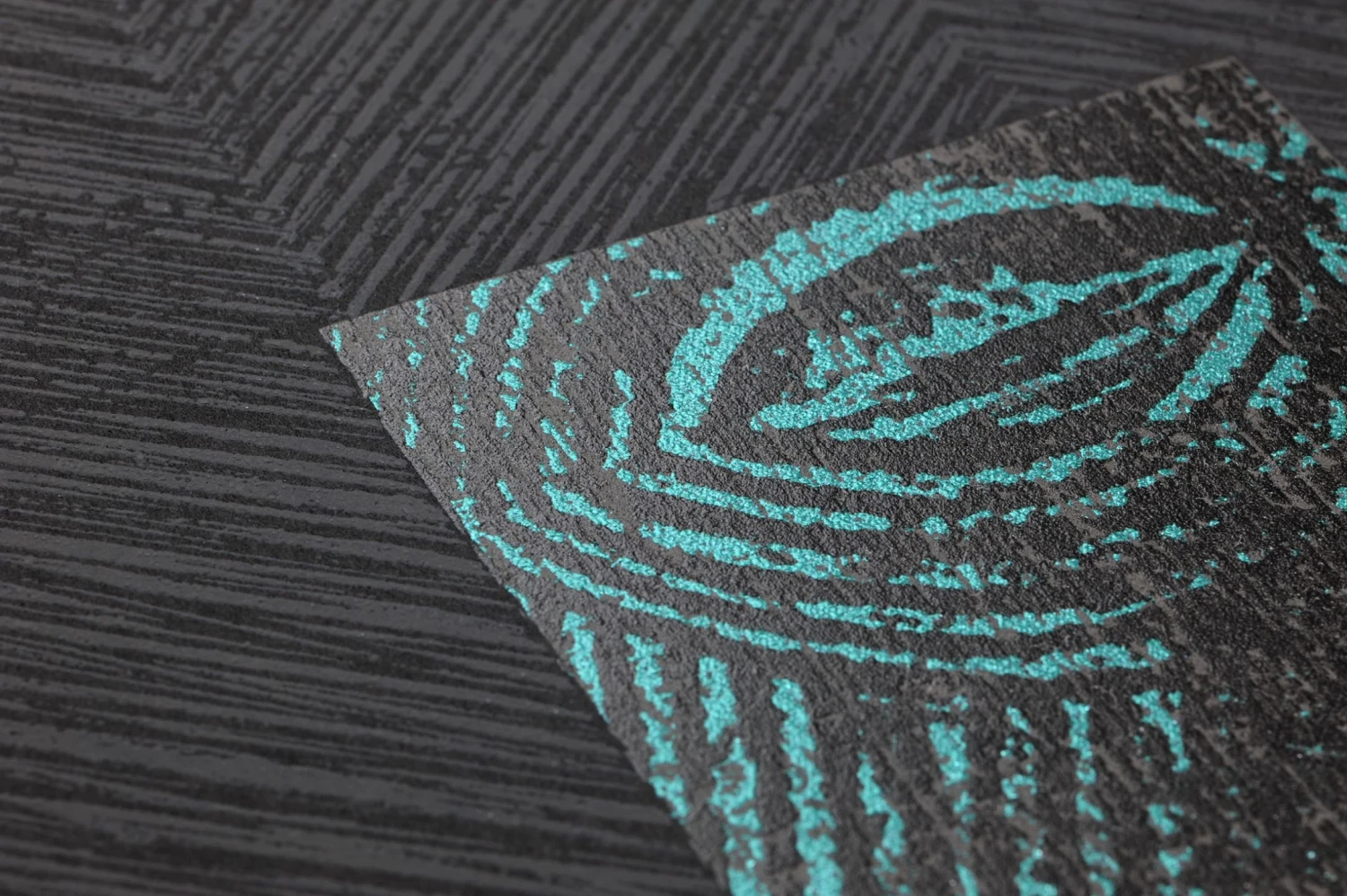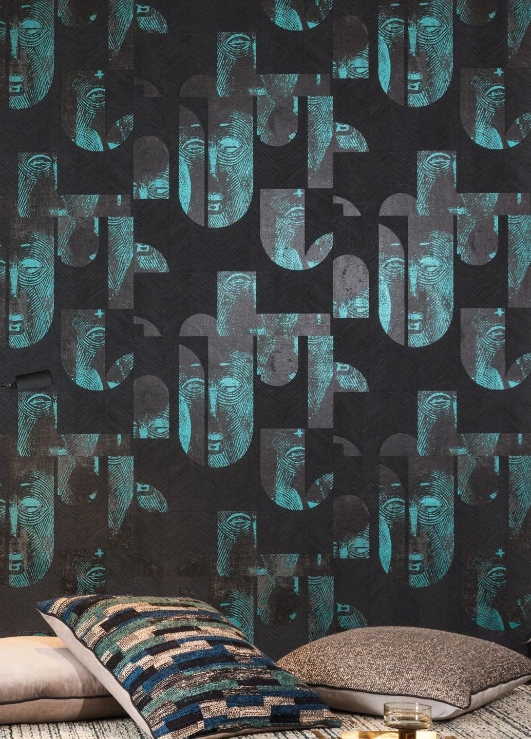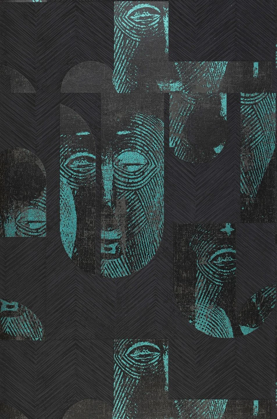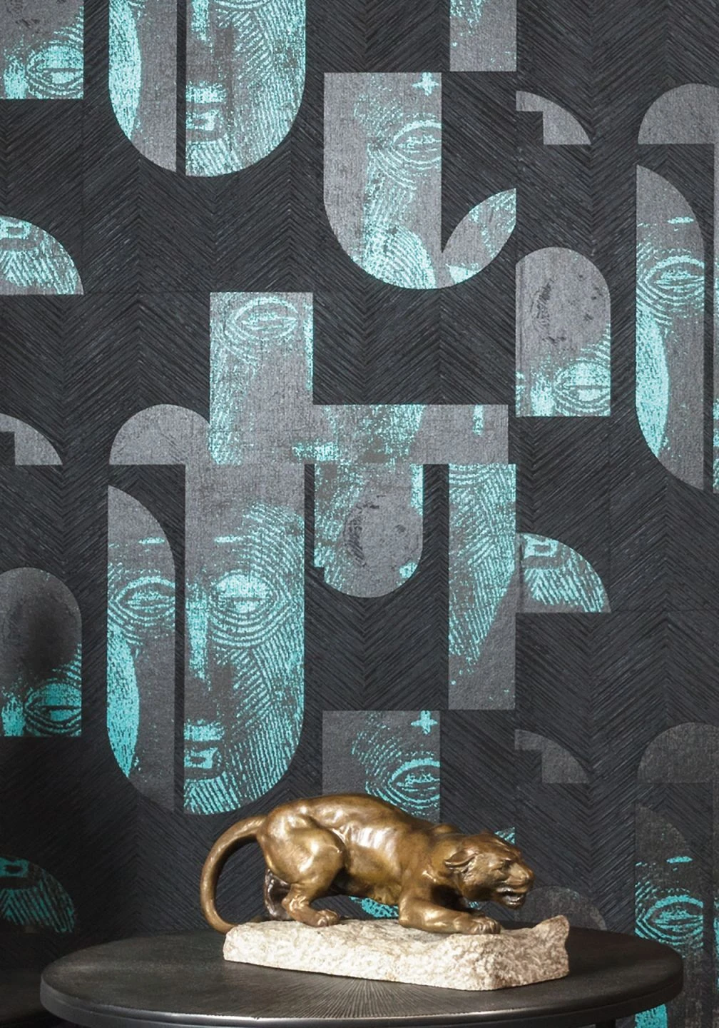 Africa meets Disco Pop – So könnte man das fetzige Tapetenmodell Orest mit seinen peppigen Musterfarben Grau, Schwarz Schimmer und Türkisblau Schimmer überschreiben. Erschaffen Sie damit eine afrikanisch angehauchte Lounge, die mit geheimnisvollen Maskenelementen aufwartet und den Raum in eine einmalige Stimmung taucht.