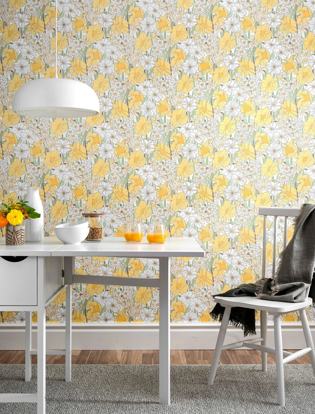 Saftiges Hellgelb dominiert bei dieser surrealistisch angehauchten Blumentapete. Die ausgefallene Designtapete erhellt Vintage-Looks mit weißer Note und lässt Hippie-Feeling neu aufkommen. Die waschbeständige Vliestapete fördert Geselligkeit und ist in Räumen wie Küche und Esszimmer goldrichtig angebracht.