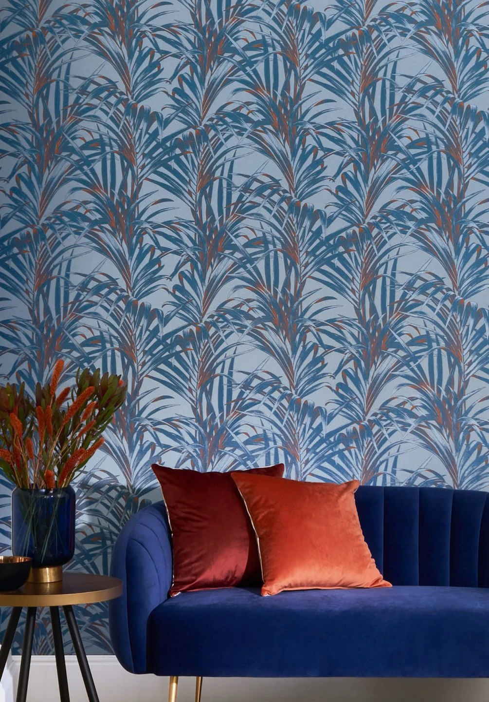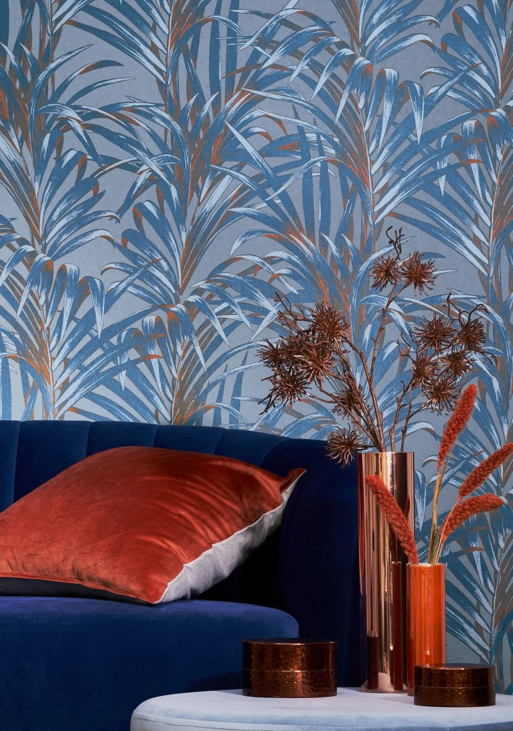 Wie in der blauen Stunde in der Abenddämmerung stehen Blautöne hier ganz im Mittelpunkt. Vom matten taubenblauen Untergrund heben sich die Palmenblätter in Azurblau und Silberblau schimmernd ab. Kupferfarbene Reflexe sorgen für zusätzliche Tiefe. Das Zusammenspiel hellerer und dunklerer Töne betont die Formen der schlanken Blätter. Eine verzauberte Atmosphäre entsteht, die Sie mit dunklen Blautönen oder durch das Aufgreifen der kupferfarbenen Akzente noch unterstützen.