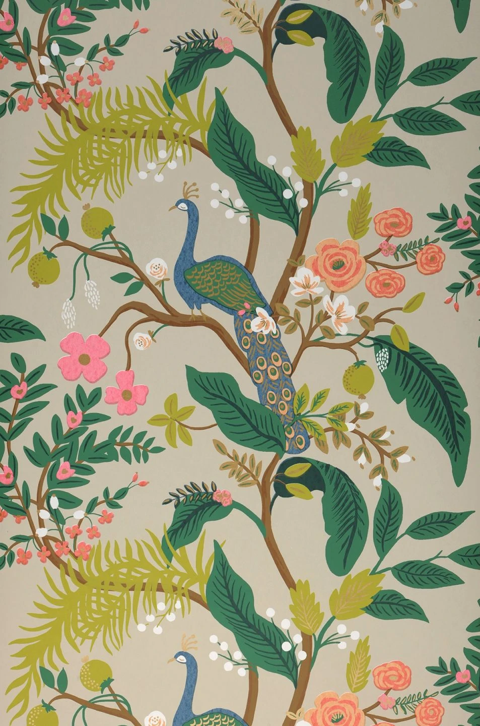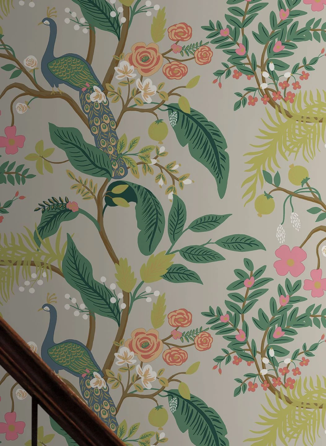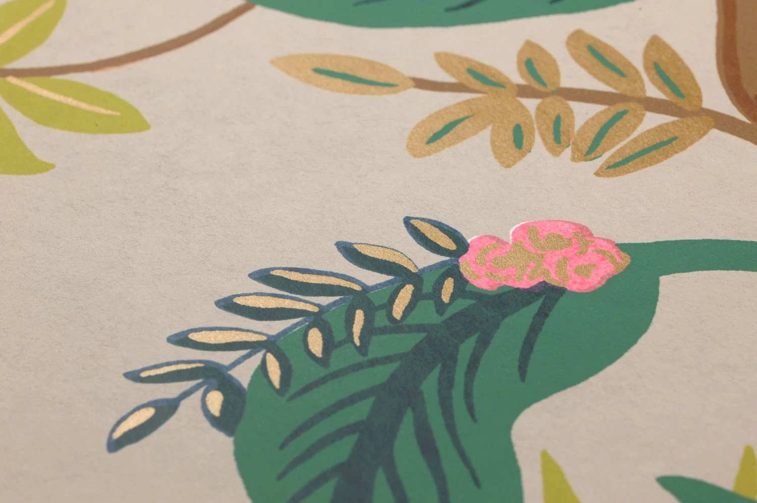Leuchtend grüne, tropische Blattpflanzen, Blüten in zarten Schattierungen von Rosa und majestätische Pfauen mit ihren prachtvollen Schwanzfedern lassen eine Atmosphäre tropischer Wärme und Lebenslust entstehen. Mit ihren goldfarbenen Highlights stellt die Vliestapete einen lebendigen, farbenfrohen Hintergrund für Ihren Raum dar, ohne sich zu sehr in den Mittelpunkt zu drängen.