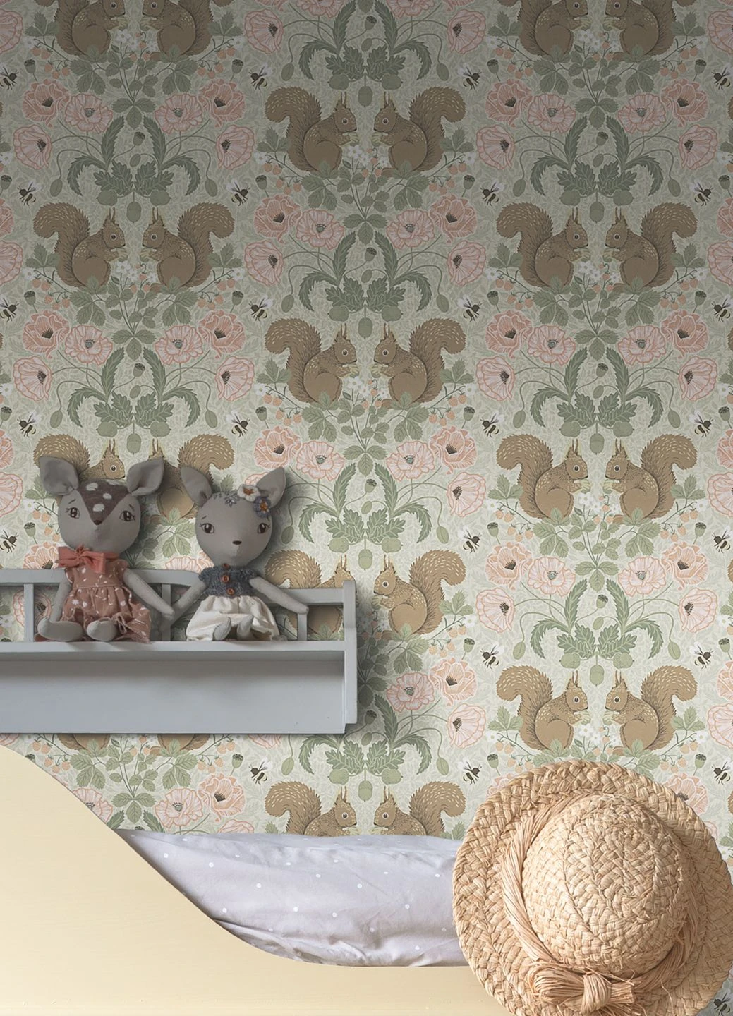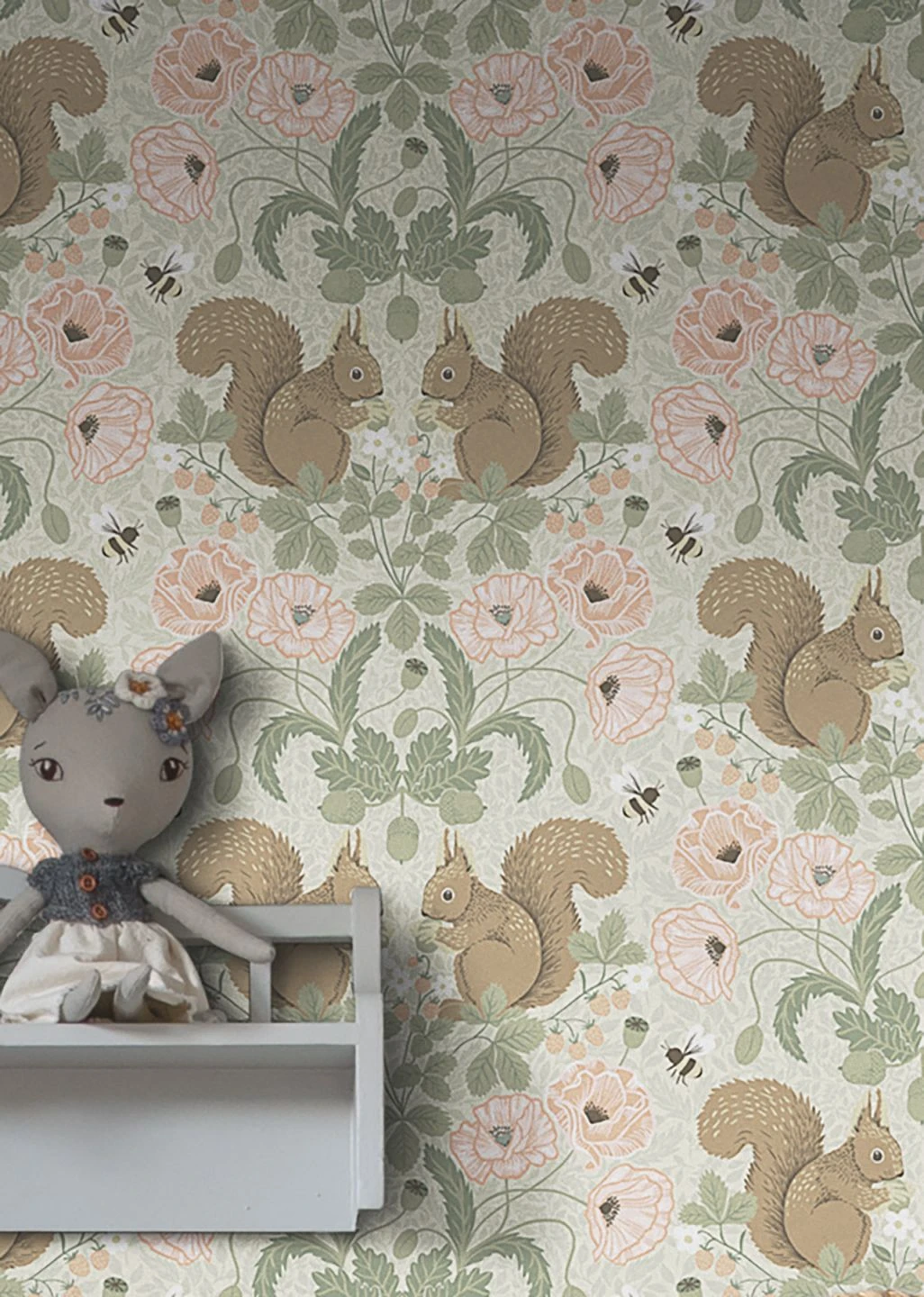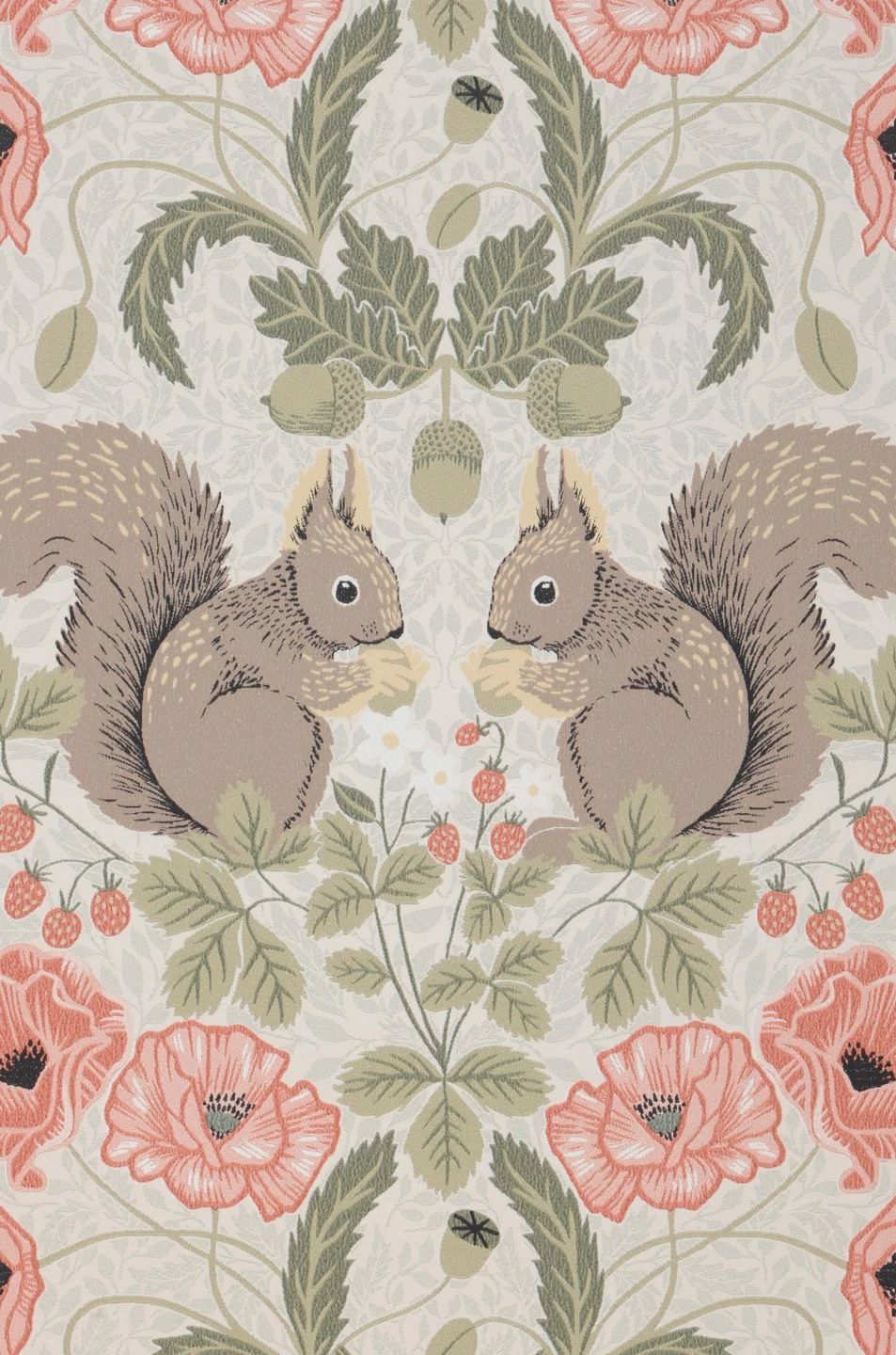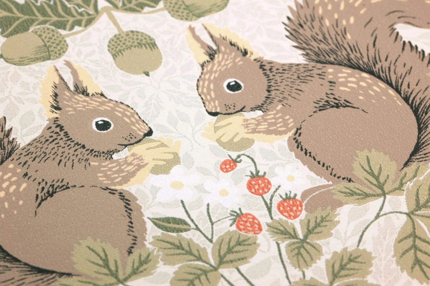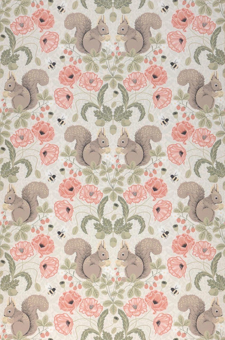Niedliche Eichhörnchen zwischen zarten rosafarbenen Blüten, Blättern und reifen Früchten bilden eine verspielte Kulisse, die sich für ein lebhaftes Kinderzimmer oder ein individuell gestaltetes Jugendzimmer ebenso einsetzen lässt, wie für Ihren Wohnbereich. Besonders gut passt das Muster, das in seiner Symmetrie den klassischen Stil mit einer großen Portion sommerlicher Leichtigkeit aufpeppt, zum einladenden skandinavischen oder zum Landhaus-Stil.