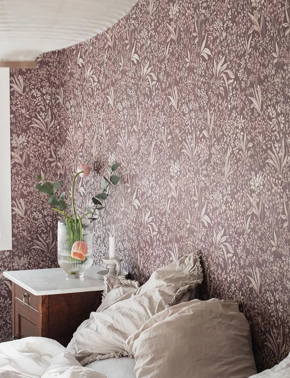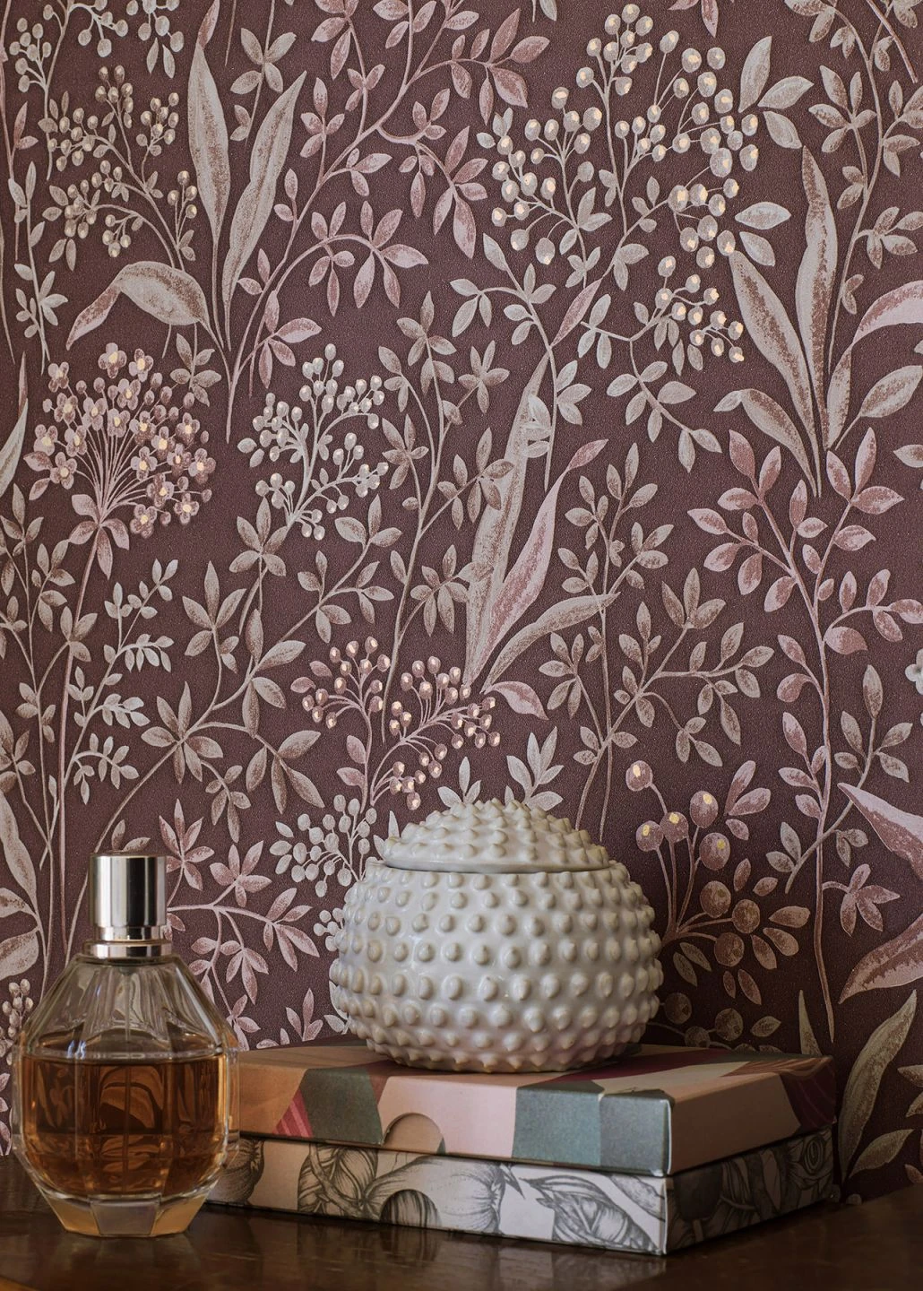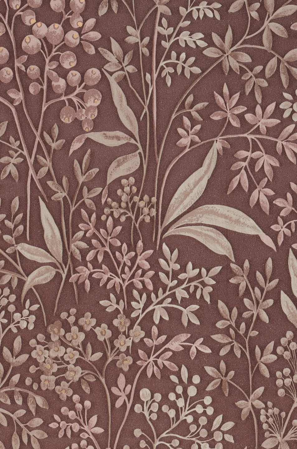 Eine wahre Fülle von Blättern, Blüten und Früchten macht die Vliestapete „Pilar“ so lebendig. Die Beschränkung auf wenige, perfekt zueinander passende Musterfarben – Blassbraun und Perlweiß – und der ideal darauf abgestimmte Hintergrund in warmem Mahagonibraun schaffen harmonische Ausgeglichenheit. Glänzende Highlights entstehen durch Farbtupfer aus schimmerndem Perlgold. Die zierlichen Pflanzen setzen Einrichtungsstile wie Romantik, helle Möbel und skandinavischen Stil gekonnt in Szene.