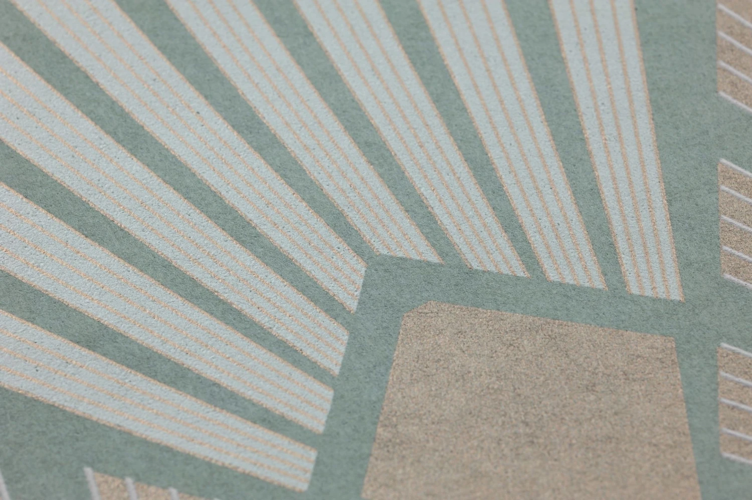 Aus dem ausgeklügelten Zusammenspiel von Farbe und Form entsteht ein Design ganz im Stil des Art Deco. Sich verbreiternde Streifen gehen wie Strahlen von rautenförmigen Zentren aus und setzen sich zu einem klaren, geradlinigen Muster aus großen Fächern zusammen, das eine mitreißende Dynamik entwickelt. Graubeige und Pastelltürkis unterstreichen den unwiderstehlichen nostalgischen Charme der Tapete.