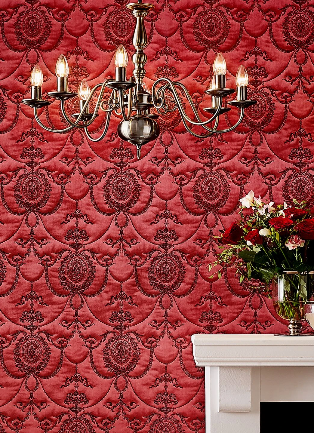 Royales Purpurrot – eine wahrhaftig königliche Farbe! Und wie in einem Palast wirkt Ihr Raum mit der barocken Tapete Rabia, die sehr überzeugend einen textilen Wandschmuck nachahmt: Zwischen den echt wirkenden Stickereien, die in das Vinyl der Oberfläche als feines Relief eingeprägt sind, wölbt sich der leicht schimmernde Stoff hervor. Würdigen Sie die höfische, historische Ausstrahlung von Rabia mit dunklen antiken Möbeln für einen außergewöhnlichen Raumeindruck.