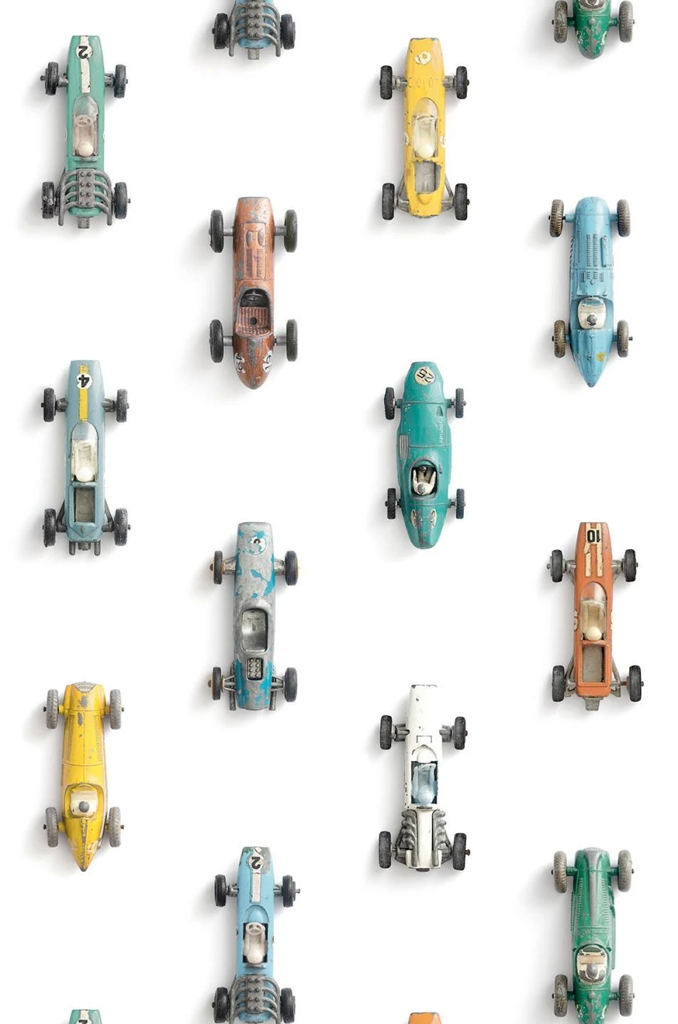 Da fahren sie auf der Wand entlang, die flotten Flitzer aus den Anfängen des Rennsports. Die nostalgischen Rennwagen wirken in der Tat wie aufgesetzte Spielzeugautos, die nur noch auf den Startschuss warten. Es könnte auch eine wertvolle Sammlung sein, die durch den weißen Hintergrund perfekt zur Geltung kommt. Die Mustertapete von Studio Ditte bietet Raum für zahlreiche Interpretationen und Aktionen.