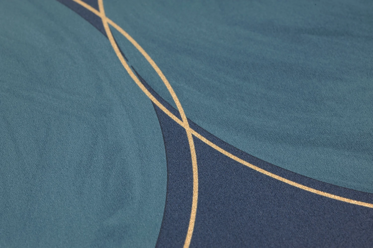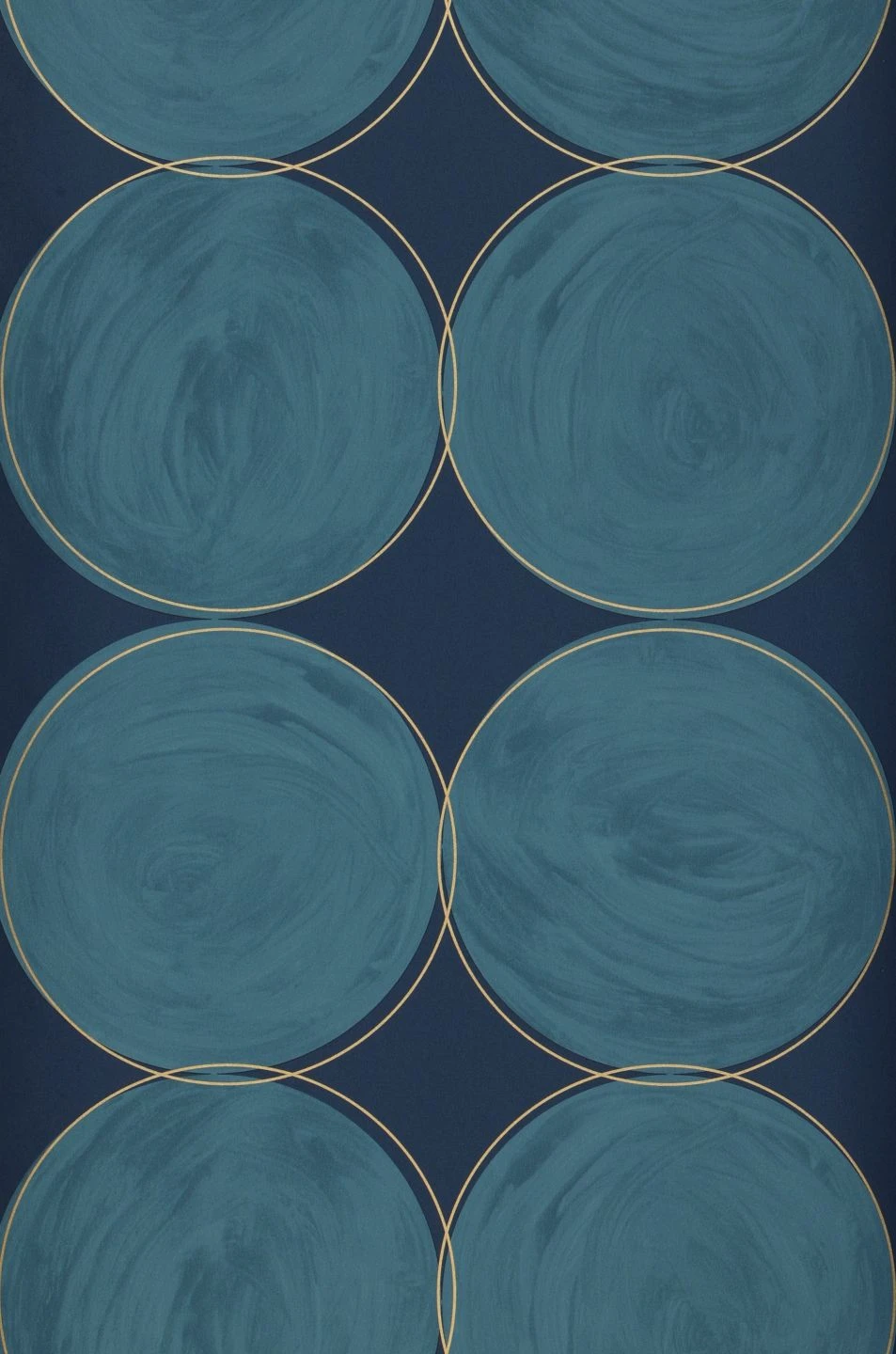 Große türkisblaue Kreise, wie von Hand mit Wasserfarben ausgemalt, deren Konturen von feinen goldfarbenen Linien umspielt werden, bilden auf dem dunkelblauen Grund von Vliestapete Rowan ein ebenso ruhiges wie ausdrucksvolles Muster. Die Blautöne kleiden ein Wohnzimmer ebenso vorteilhaft wie ein Schlafzimmer und lassen sich durch ihre unempfindliche Vinyloberfläche auch in Küche oder Bad problemlos einsetzen.