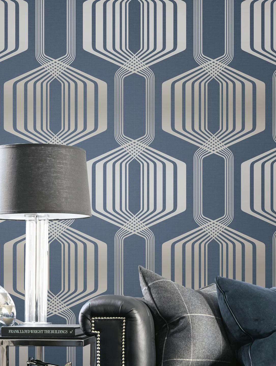 Abstrakte graphische Elemente verbinden sich miteinander, driften auseinander und wieder zusammen und erwecken echtes 70er-Jahre-Feeling. Besonders edel wirkt die Tapete in der hier gezeigten Kombination aus dunkelblauem Untergrund und schimmerndem Perlhellblau als Musterfarbe. Sie erhalten sie auch in elegantem Weißgrau und in den Retro-Farbtönen Graubraun mit Perlbeige und Rosenholz.