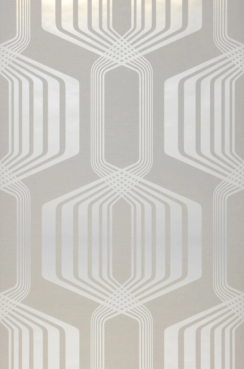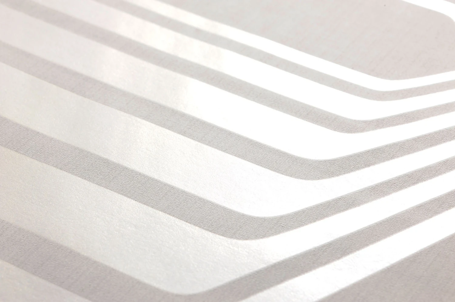 Die sich überkreuzenden verschieden breiten Linien und Balken in elegant schimmerndem Perlglanz-Weiß auf lichtem, weißgrauem Grund lassen an den Strahlengang von Lichtstrahlen durch ein Prisma denken. Das kräftige, an die 70er Jahre erinnernde Retro-Muster wirkt in der Farbkombination Weißgrau besonders elegant. In den ebenfalls erhältlichen Farbvarianten Dunkelblau und Graubraun entwickelt es einen jeweils anderen reizvollen Charakter.