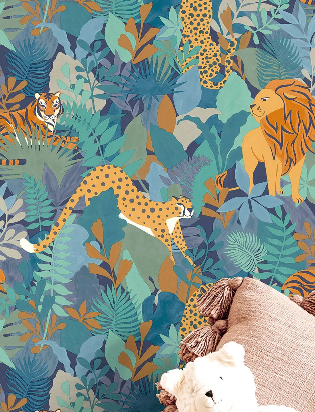 Voller Kraft und Eleganz durchstreifen Löwen, Tiger und Leoparden einen tropischen Urwald. Von den Grün- und Blautönen der exotischen Blattpflanzen heben sich die Farben ihres Fells wunderschön ab. Ob Kinderzimmer oder Jugendzimmer, auf diese Weise beschützt kann man sich wirklich sicher fühlen! Die Papiertapete lässt sich mit den passenden Wandfarben geschickt zu einer tollen Raumwirkung verbinden.