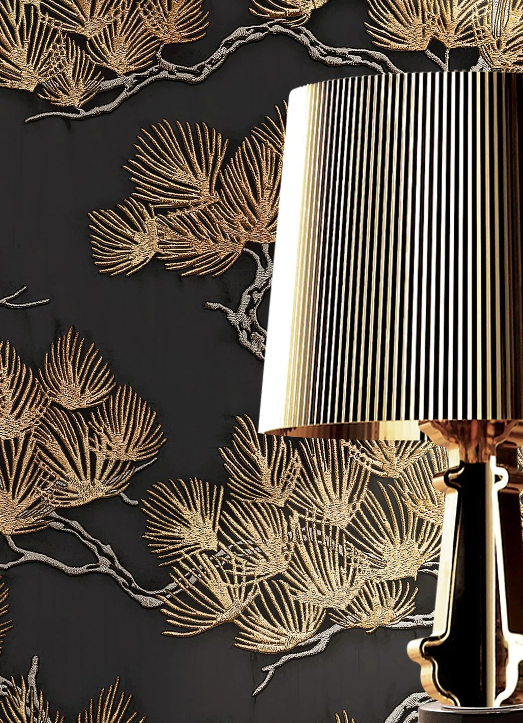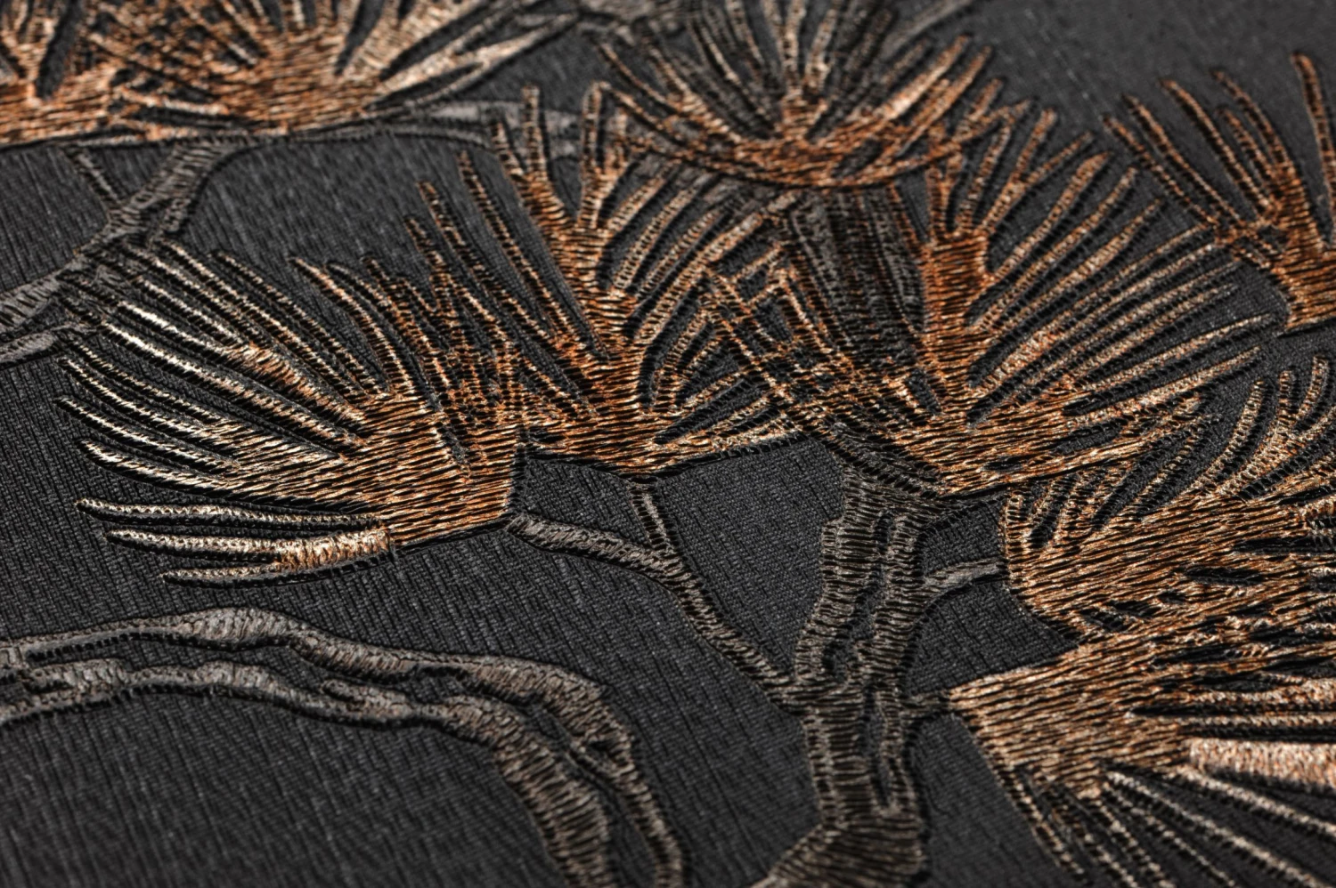 Eine Tapete wie eine handgearbeitete Stickerei: In die Vinyloberfläche ist das Motiv wie feine, fühlbare Stickstiche eingeprägt. Knorrige Pinienzweige mit langen, schlanken Nadeln in Perlbeige und leicht schimmerndem Ockerbraun scheinen auf dem anthrazitfarbenen Grund wie von selbst zu leuchten. Die hübsche Tapete ist eine Hommage an die japanische Kunst. Mit asiatischen Elementen in Ihrer Einrichtung betonen Sie die Anklänge an die Kultur des Fernen Ostens.