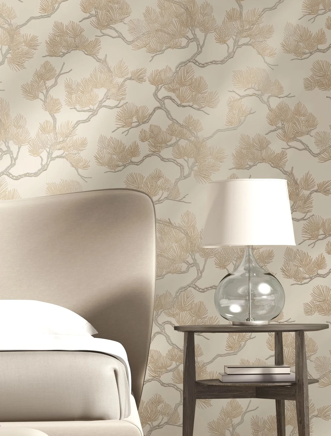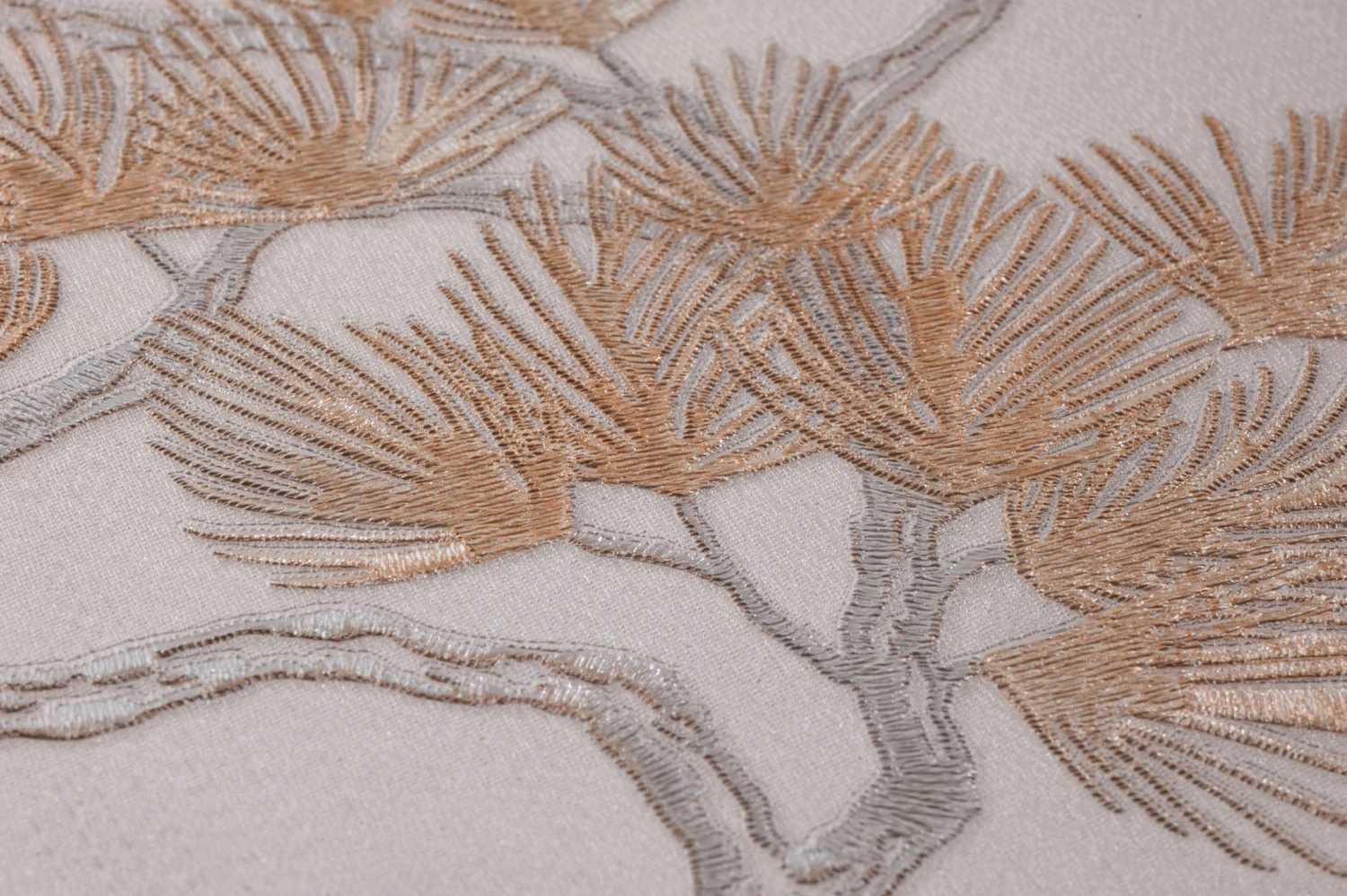 Pinienzweige mit ihren feinen, schlanken Nadeln vereinen die beschützende Atmosphäre eines Waldes mit luftiger, lichtdurchfluteter Offenheit. Die leicht schimmernden Beige- und Weißsilbertöne auf dem cremeweißen Grund wirken freundlich und elegant zugleich. Die feine, fühlbare Struktur des Musters ist in das Vinyl der Tapetenoberfläche eingeprägt und erinnert an eine kostbare Stickerei im fernöstlichen Stil.