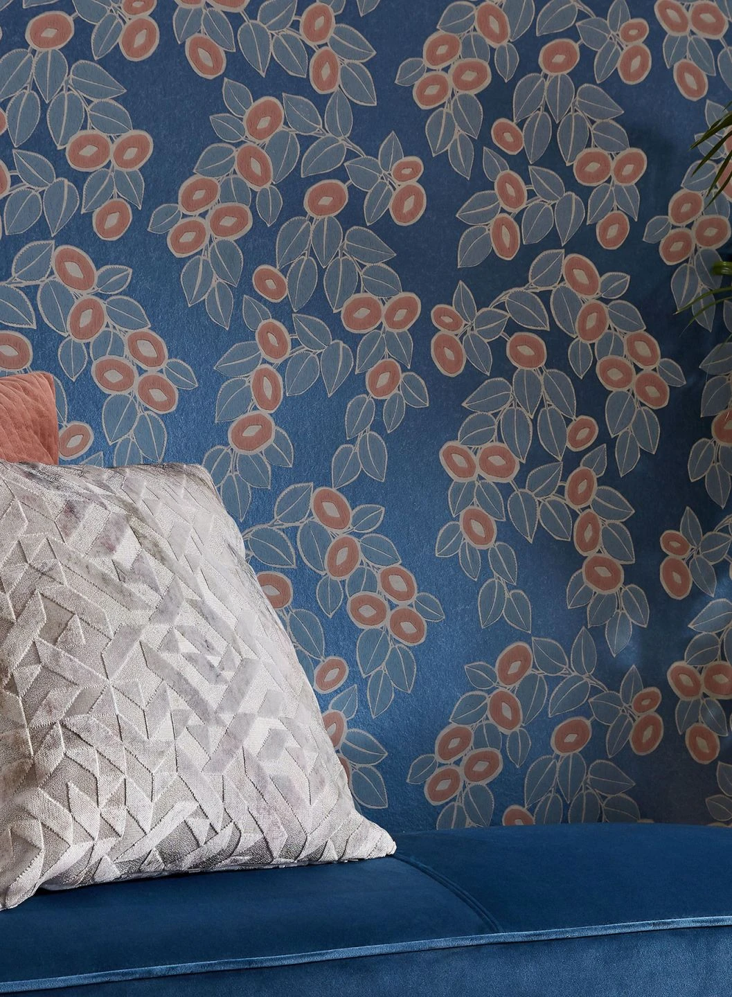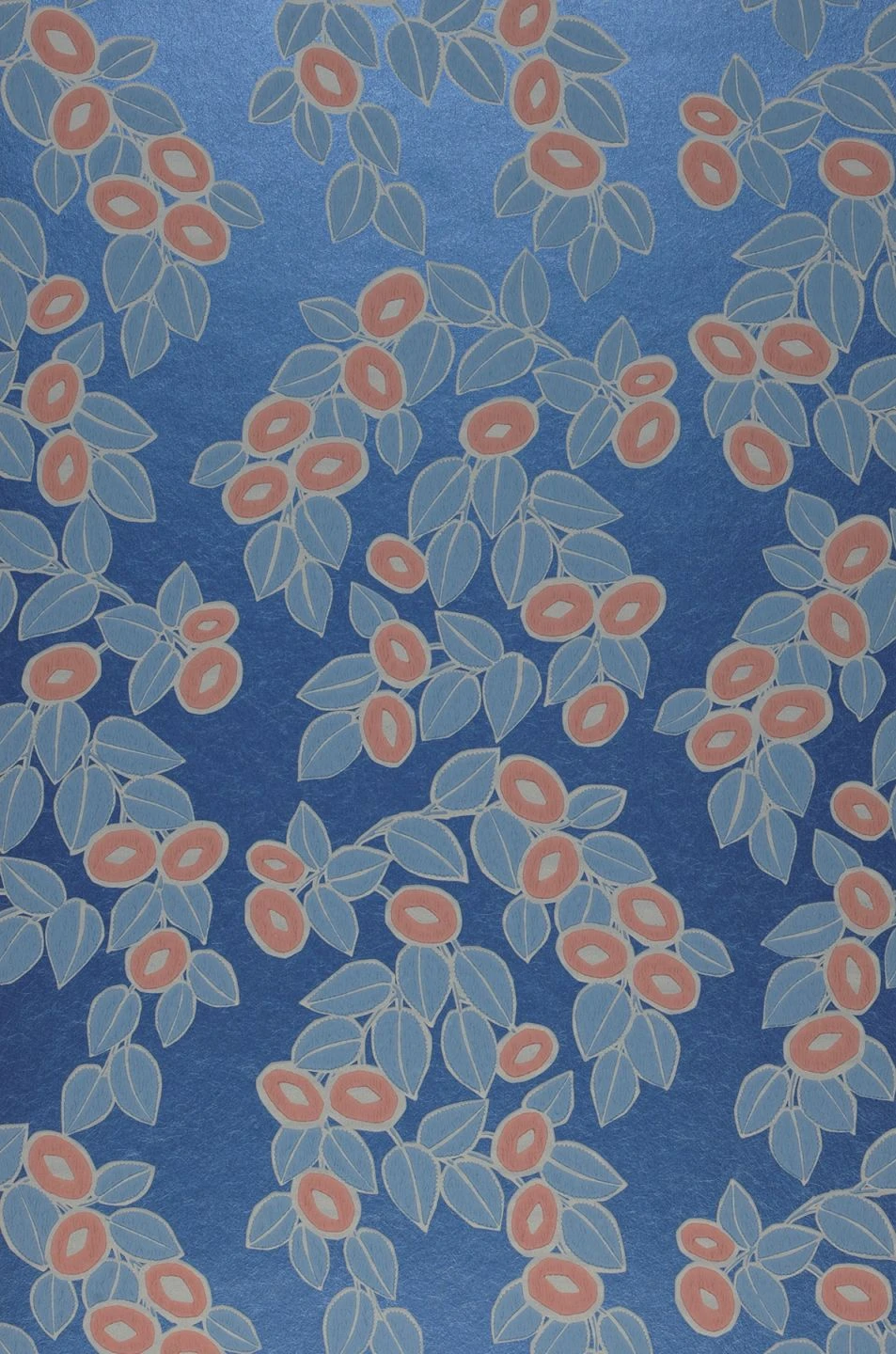 Stilisierte Blüten und Blätter in Azurblau und Rosé ranken sich über den blau schimmernden Untergrund. Helle kieselgraue Highlights lassen die Konturen fast plastisch hervortreten. Die Kombination von matten und glänzenden Elementen verleiht den Ranken im Spiel der einfallenden Lichtreflexe einen belebten Eindruck.